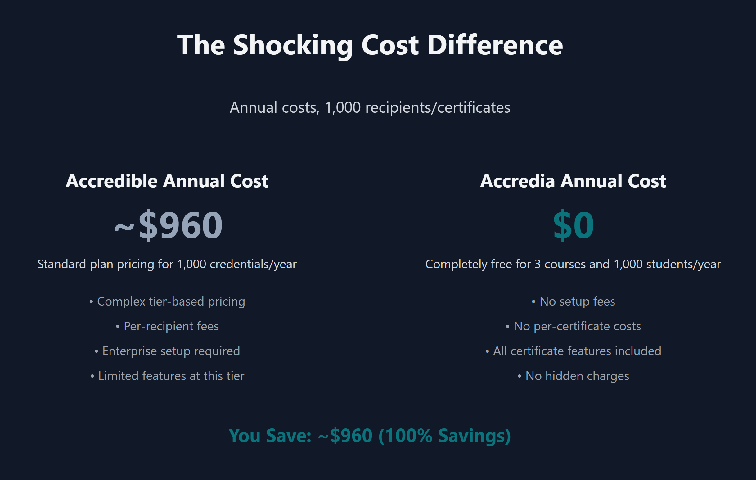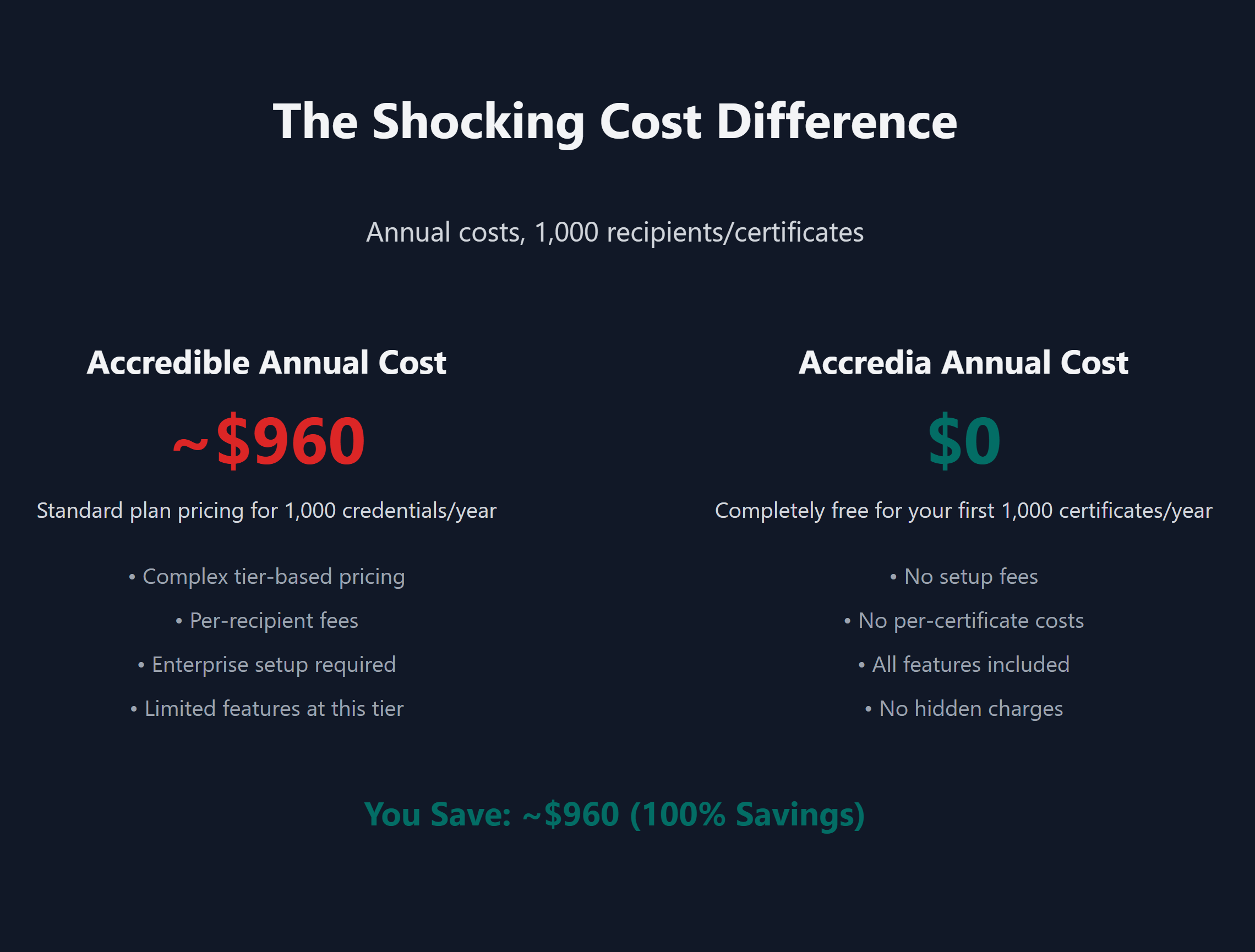 To get a meaningful number of credentials on Accredible, you have to pay nearly a thousand dollars. That's a significant cost before you've even scaled.
