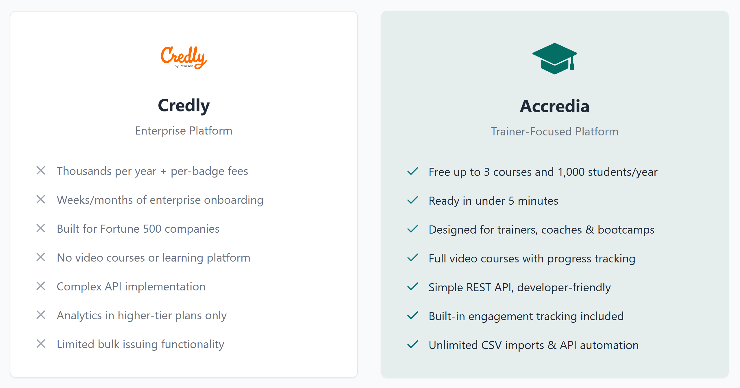 Accredible charges trainers ~$960 a year for what we believe should be free. Accredia gives you a powerful free plan plus video courses—supporting your program's launch and saving you money from day one.