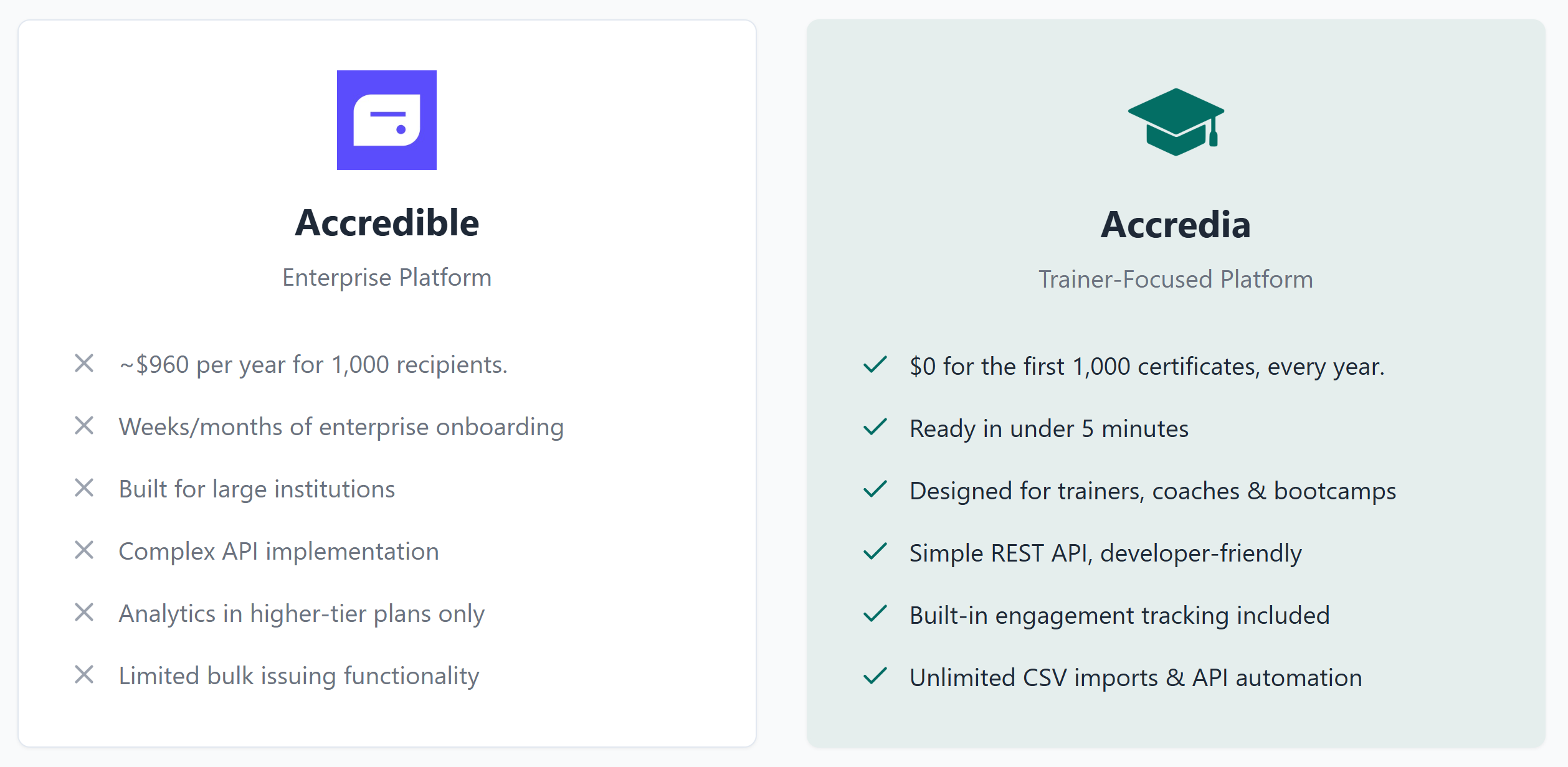 Accredible charges trainers ~$960 a year for what we believe should be free. Accredia gives you a powerful, generous free plan that supports your program's launch and saves you money from day one.