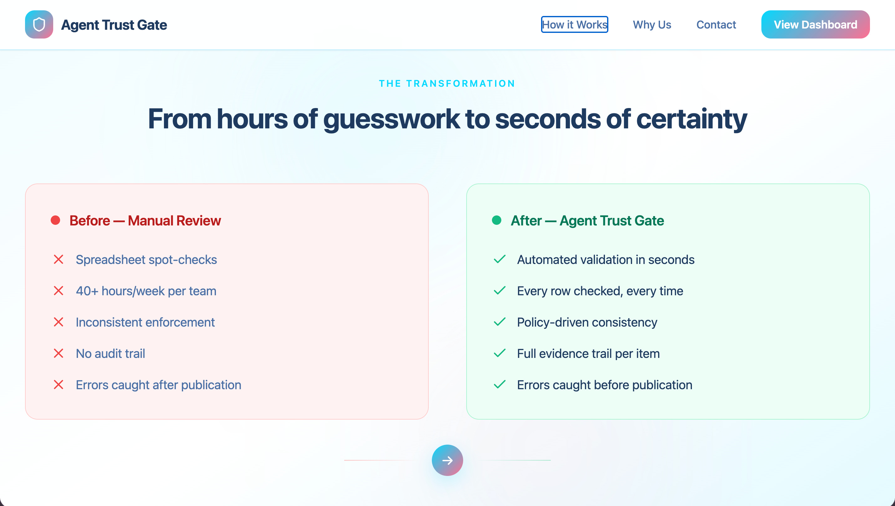 Not entirely — and that’s the point. Agent Trust Gate automates the ~80% of checks that are deterministic (format, completeness, restricted items) and uses AI for the ~2% that require judgment (taxonomy mapping, ambiguous descriptions). Humans stay in the loop for high-risk decisions. The goal is to reduce 40+ hours/week of spreadsheet review to minutes of focused exception handling.