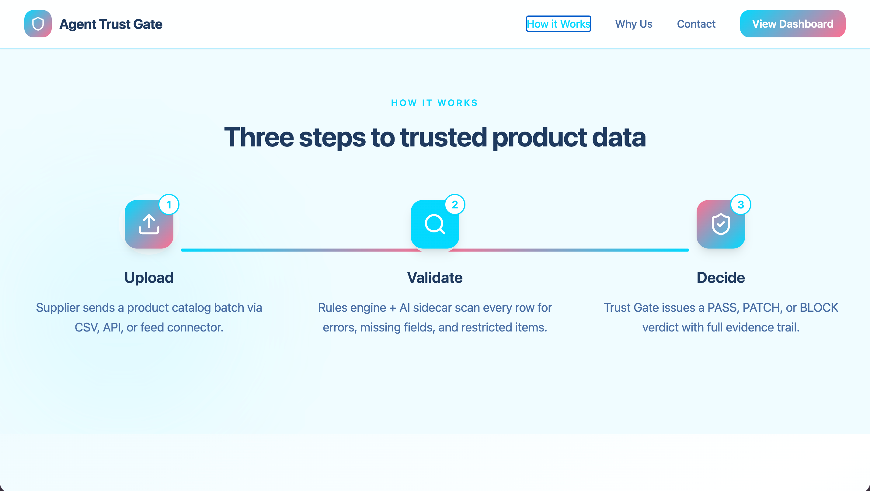 Agent Trust Gate is a rules-first AI validation system that automatically checks every product listing in a supplier batch before it reaches the catalog. It delivers instant PASS, PATCH, or BLOCK verdicts with full evidence — which rows failed, which fields, why, and estimated time to fix.