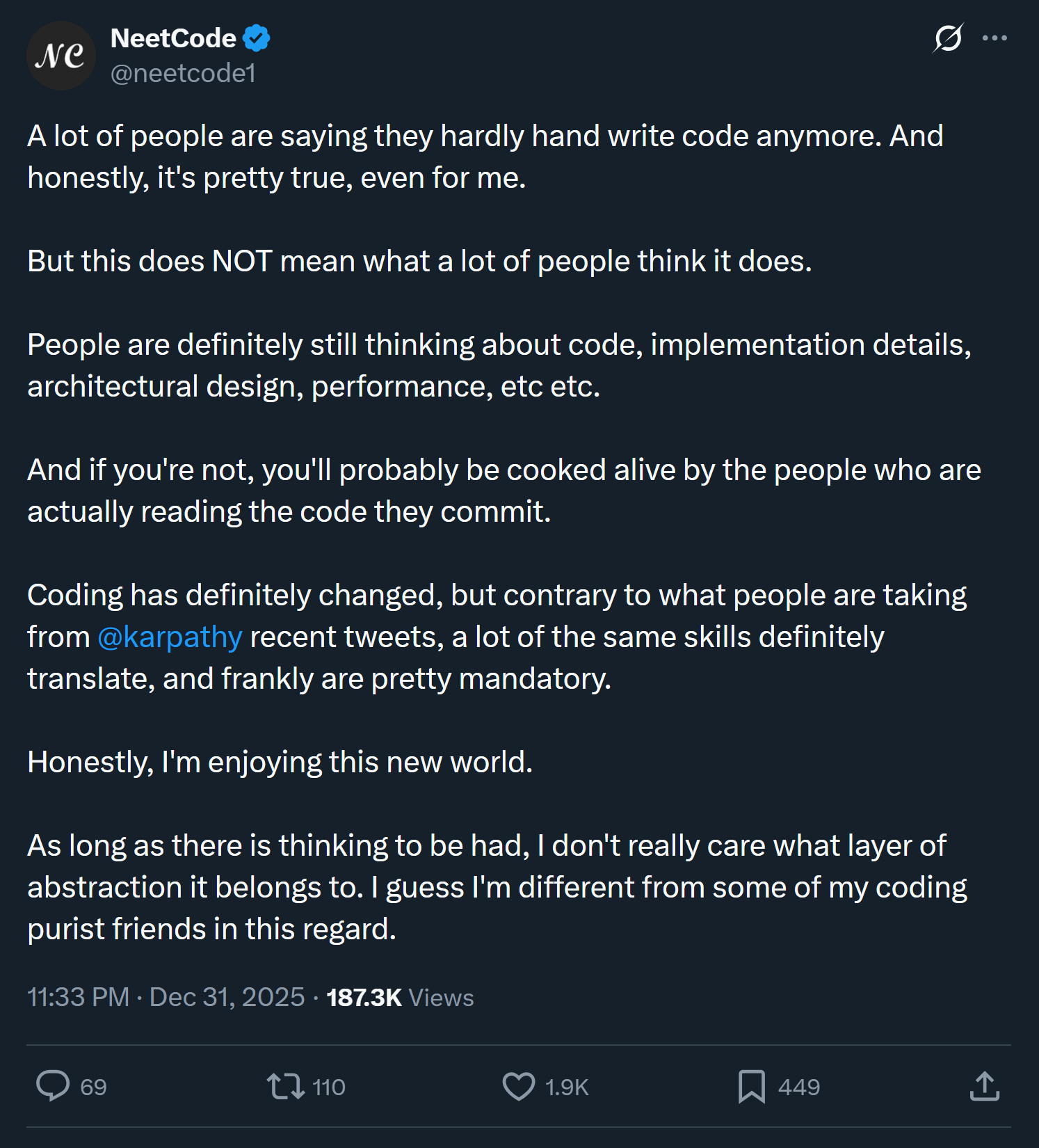 Engineers admit they’ve stopped coding (reported by a former Google engineer and the founder of the coding interview preparation website and platform NeetCode.io):