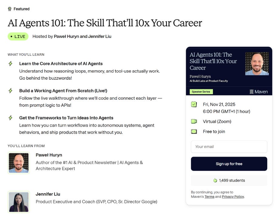 A free lighting session, Fri, Nov 21, 2025. Join 1,502 AI PMs (and growing fast). #1 most popular session on Maven.