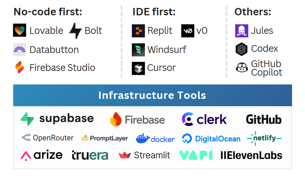 I listed many tools, but in practice, Lovable, Supabase, GitHub, and Netlify are 80% of what you need. You can add Stripe. No coding.