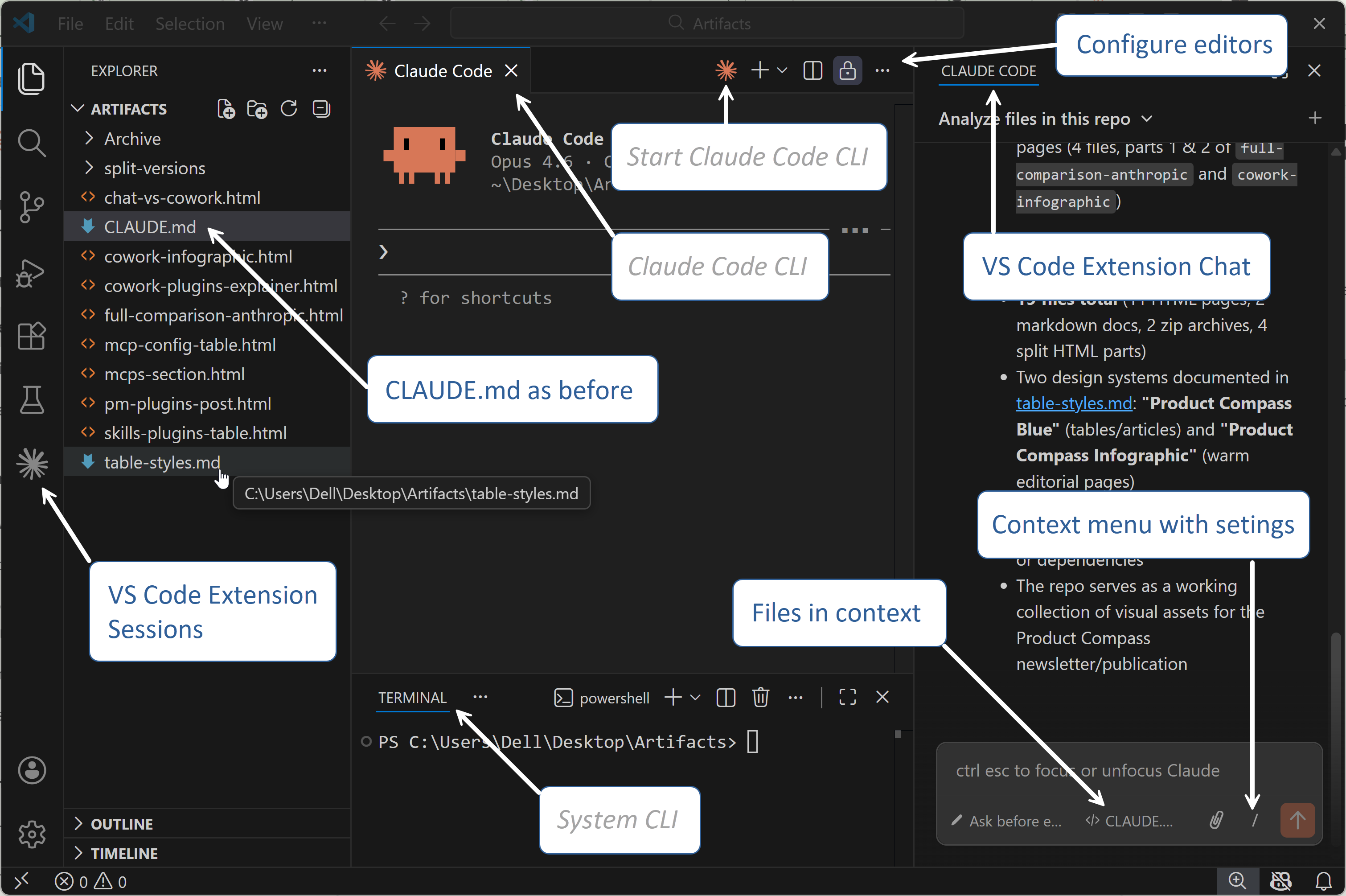 Left panel: Explorer. Your files and folders — always visible, always navigable. This is what makes Code feel different from Cowork.
