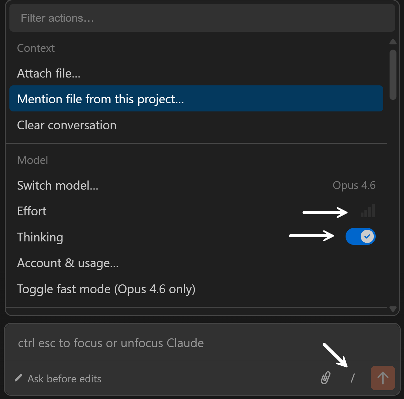 In Chat, you toggle extended thinking on and off. In Cowork, it's adaptive. In Code, it's adaptive by default — but you get direct control via /effort. Higher for complex analysis, lower for quick edits: