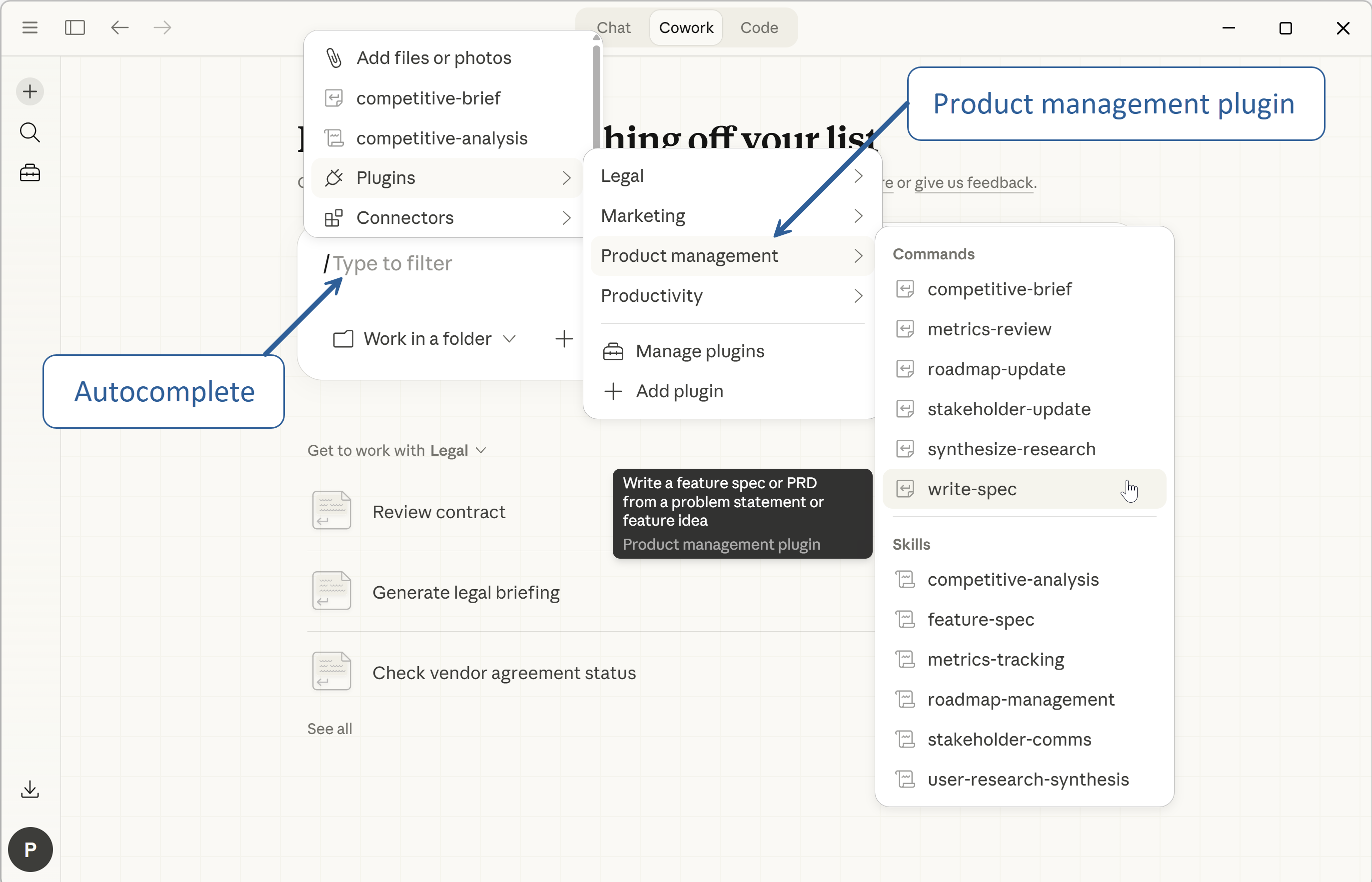Cowork ships with 11 plugins from anthropics/knowledge-work-plugins (productivity, product-management, legal, finance, marketing, data, etc.)