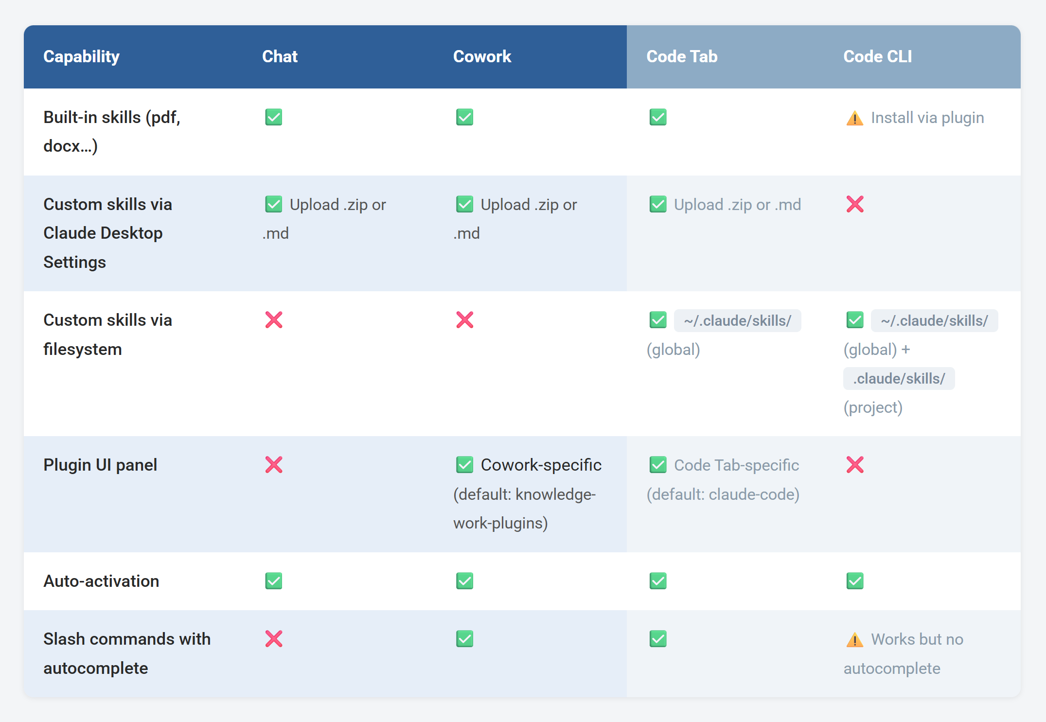 Note: Cowork and Code Tab have separate, isolated plugin panels. Installing a plugin in one doesn't make it available in the other. Skills uploaded via Claude Desktop settings are shared across Chat, Cowork, and Code Tab.