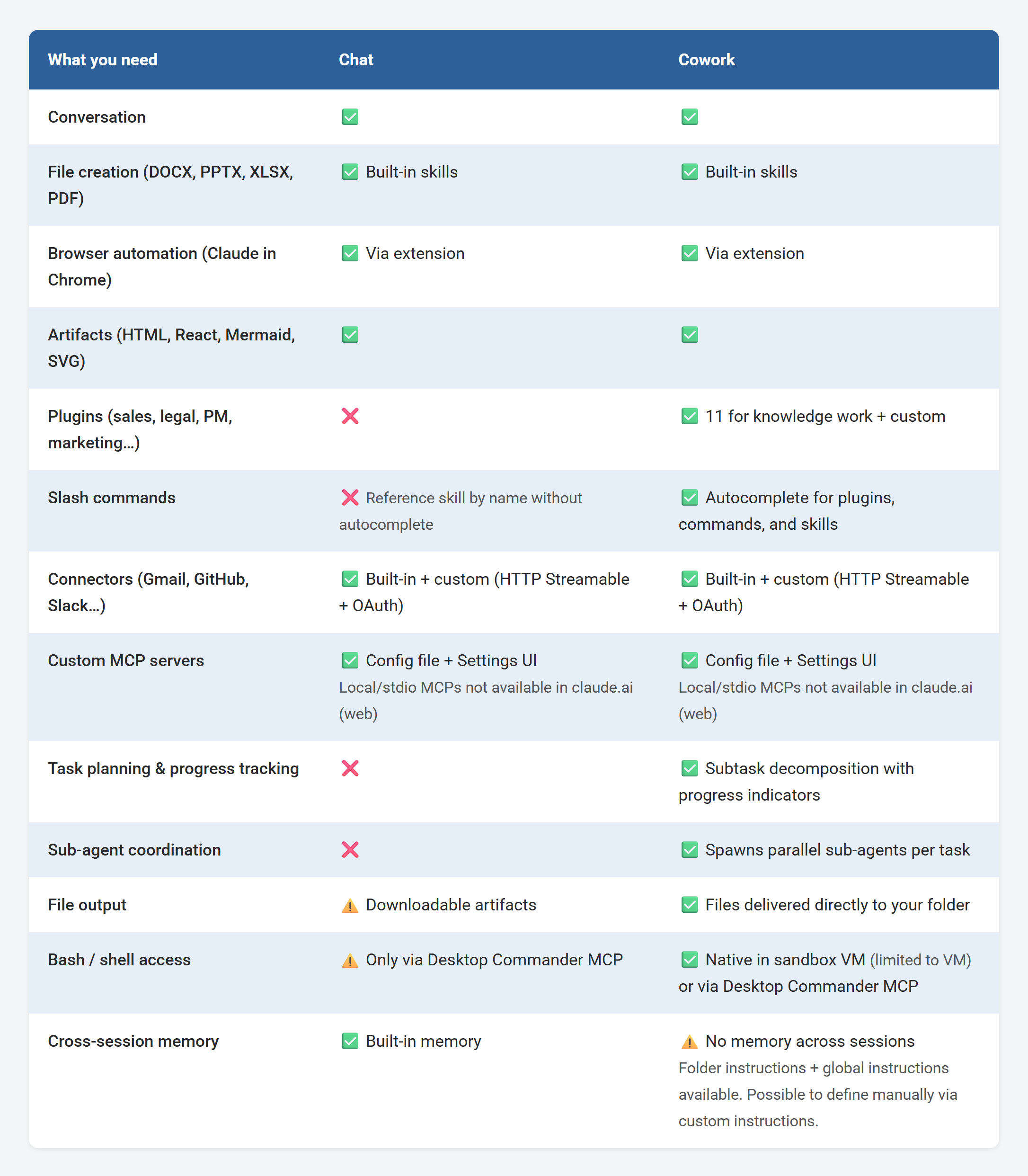 Many of you already use Claude Chat in the Desktop app. You might be wondering: what does Cowork add? Here’s my comparison: