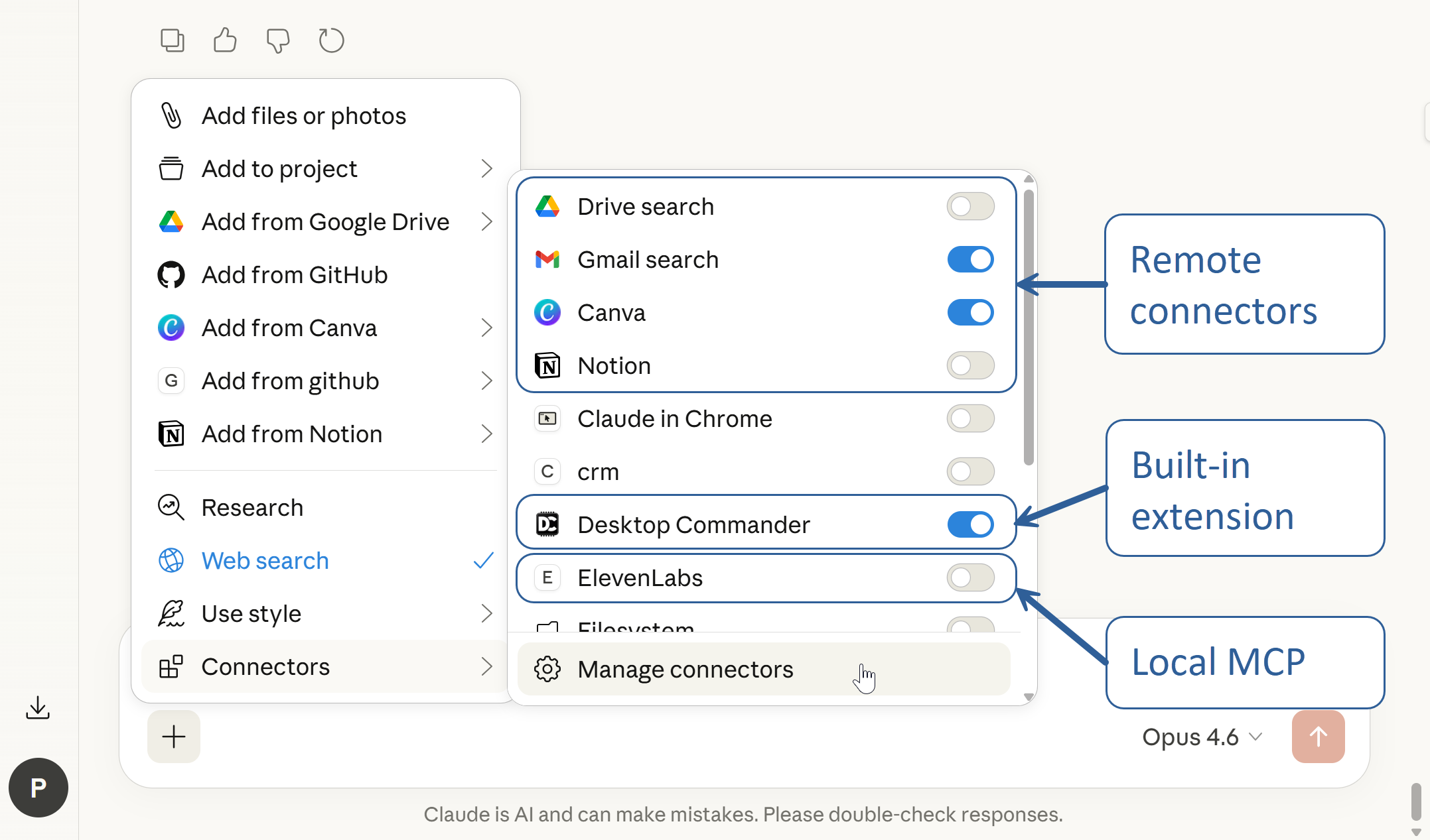 }What might be a bit confusing is that Claude Desktop presents them all in a single “Connectors” interface with on/off toggles: