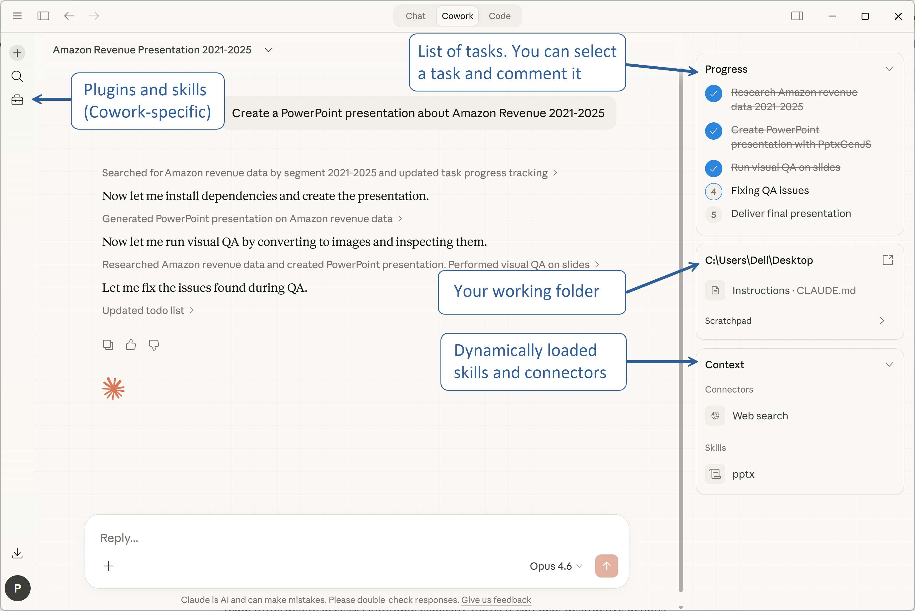 In short, Cowork adds what matters for getting real work done: sub-agent coordination that handles parallel work, task decomposition, and files delivered directly to your folder instead of chat artifacts.