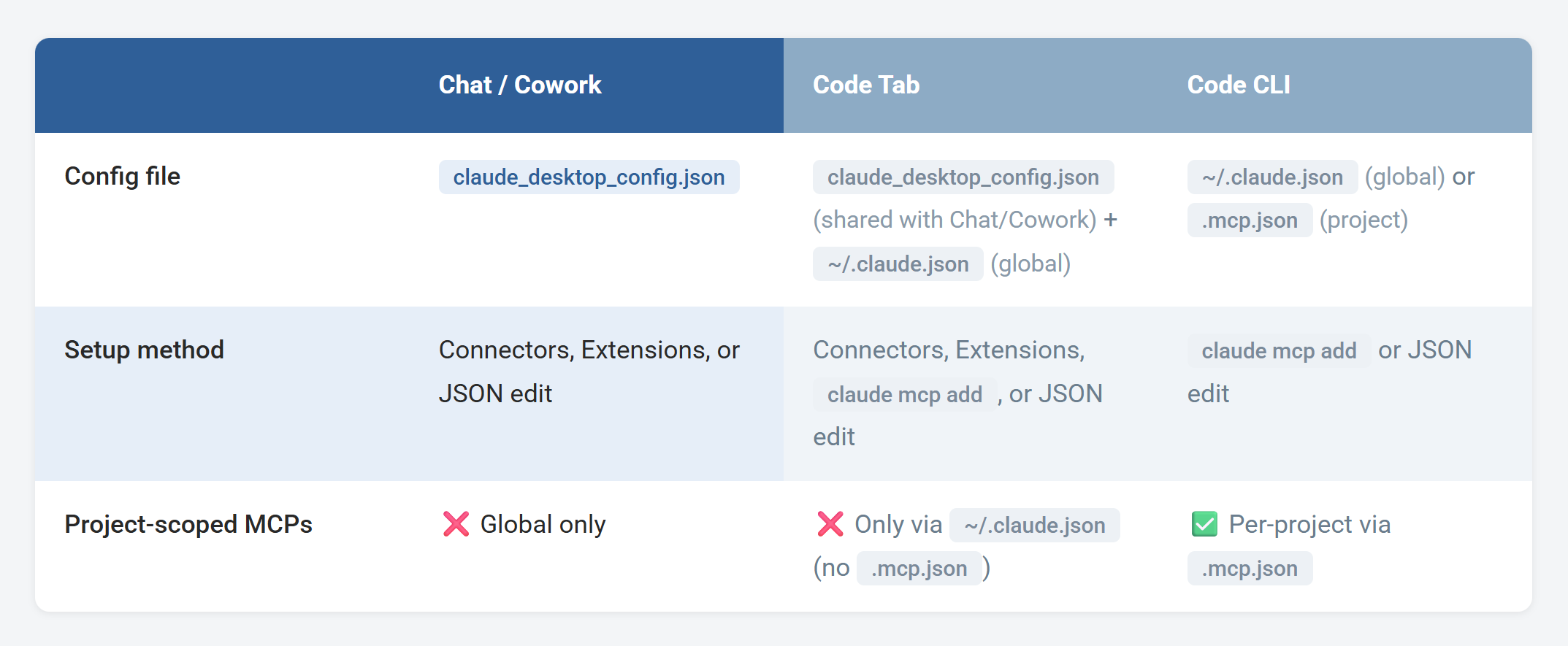 Different tools use different config methods. For example, adding an MCP server to Chat makes it available in Cowork, and Code Tab, but not Code CLI: