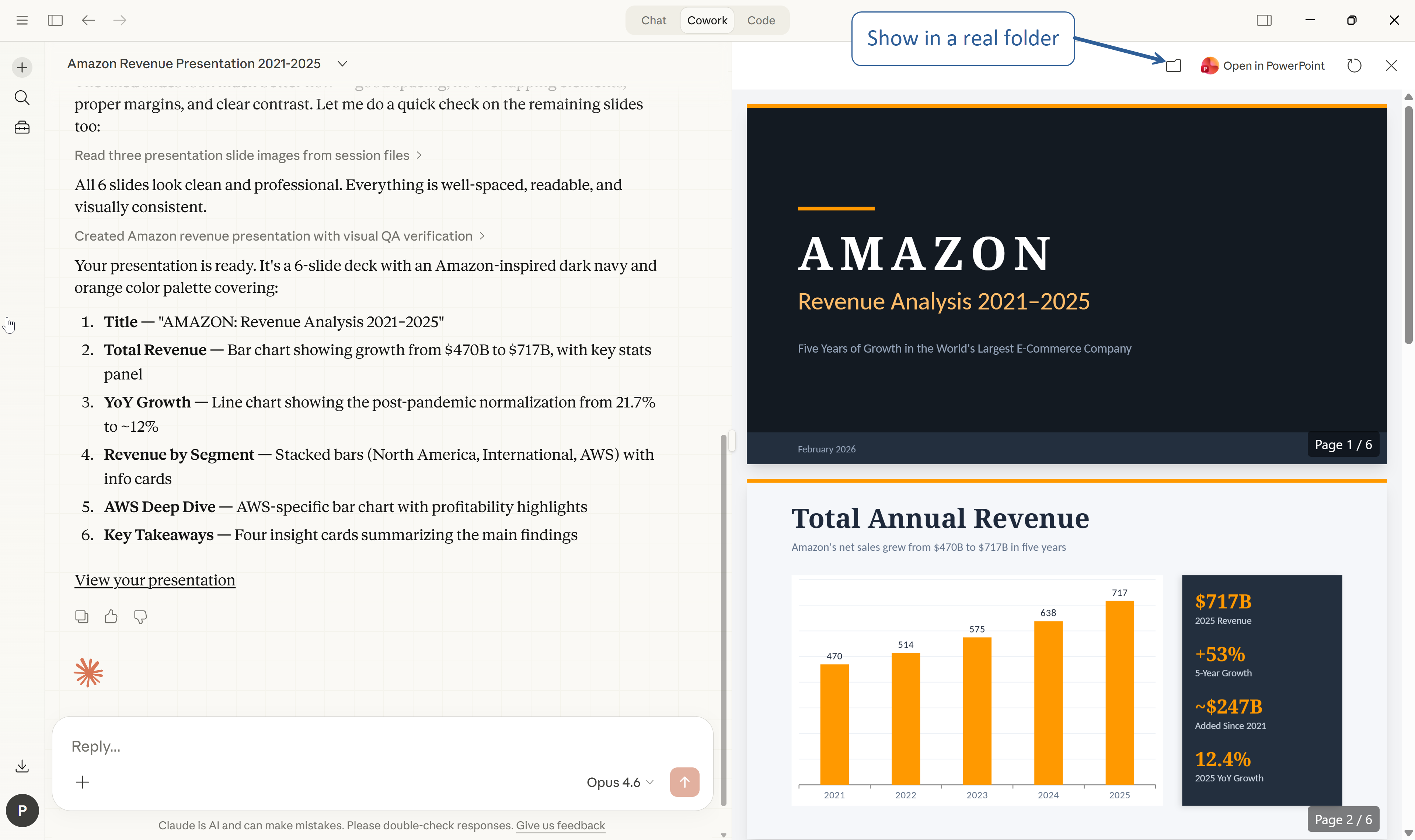 It creates real files. Not an artifact. Actual .docx, .pptx, .xlsx, and .pdf files delivered to the folder you granted access to.