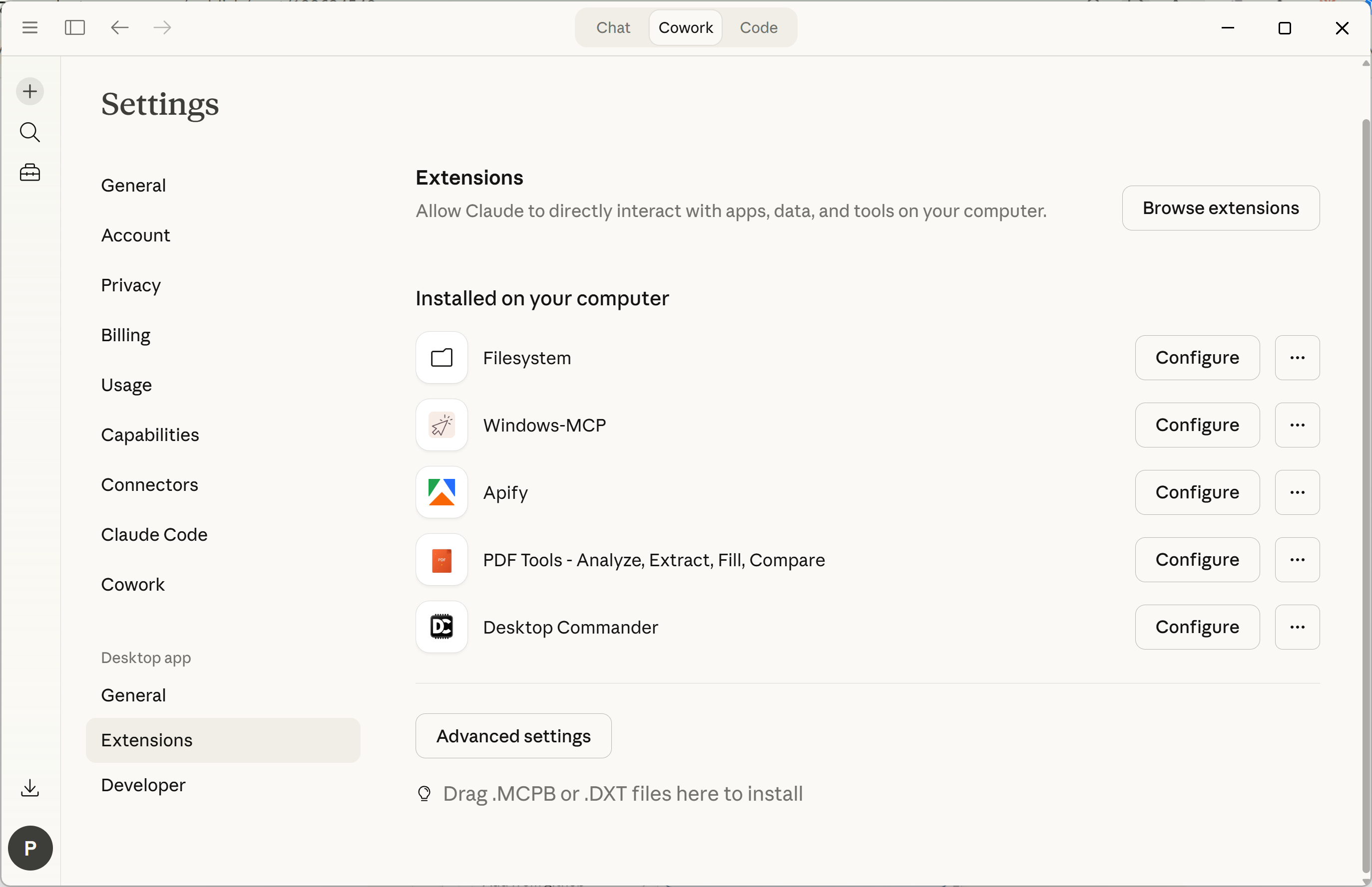 Extensions are how Anthropic packages local MCP servers for one-click install — they show up in both the Extensions panel (to install/remove) and the Connectors panel (to toggle on/off). You manage them in “Settings > Extensions”: