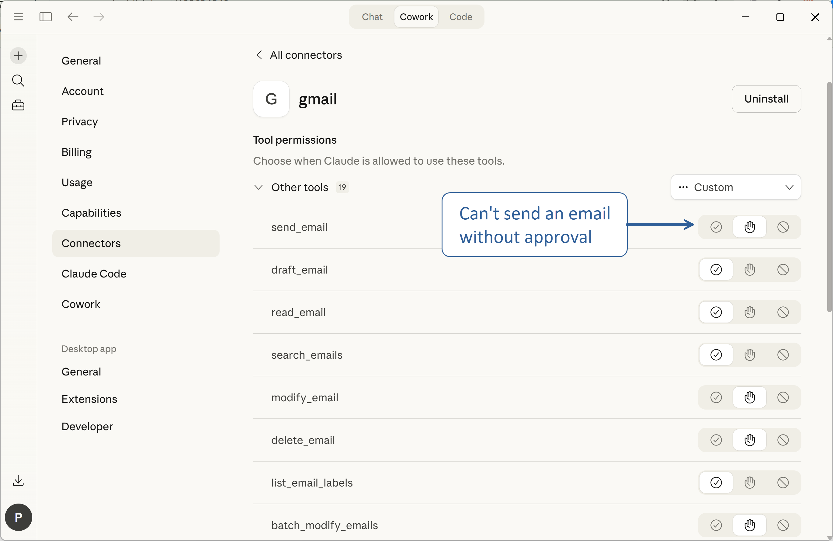 For every connector, you can set individual tools to Allow (runs automatically), Ask (confirms before running), or Block (never runs). You could allow Claude to search your emails but block it from sending them. Click: “Settings → Connectors”: