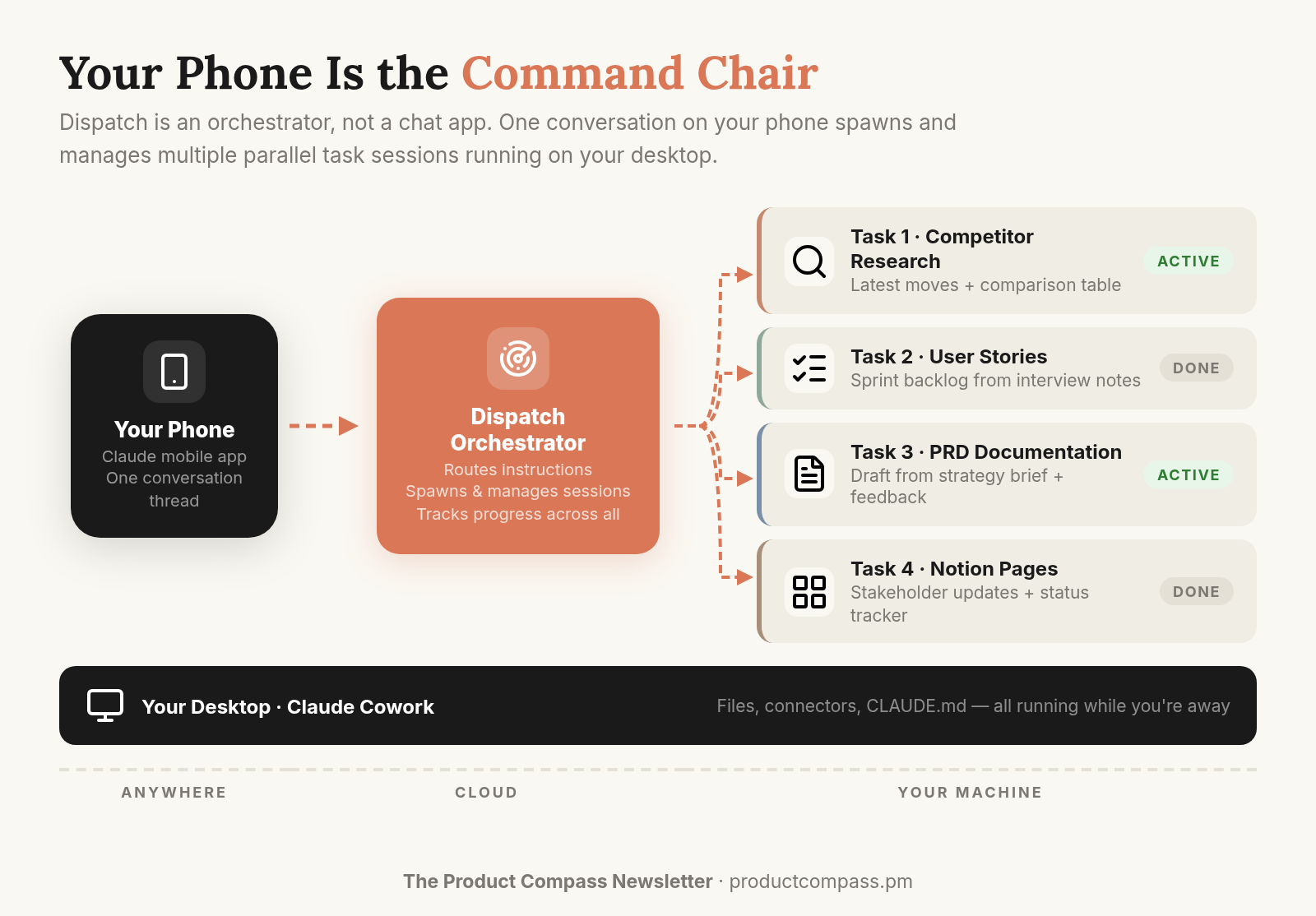For PMs: You don't do one thing at a time. You're tracking competitive moves while waiting for a stakeholder response while preparing sprint artifacts. Dispatch lets AI match that rhythm instead of forcing sequential mode. The ceiling isn't your output speed — it's how many parallel tracks you can direct at once.