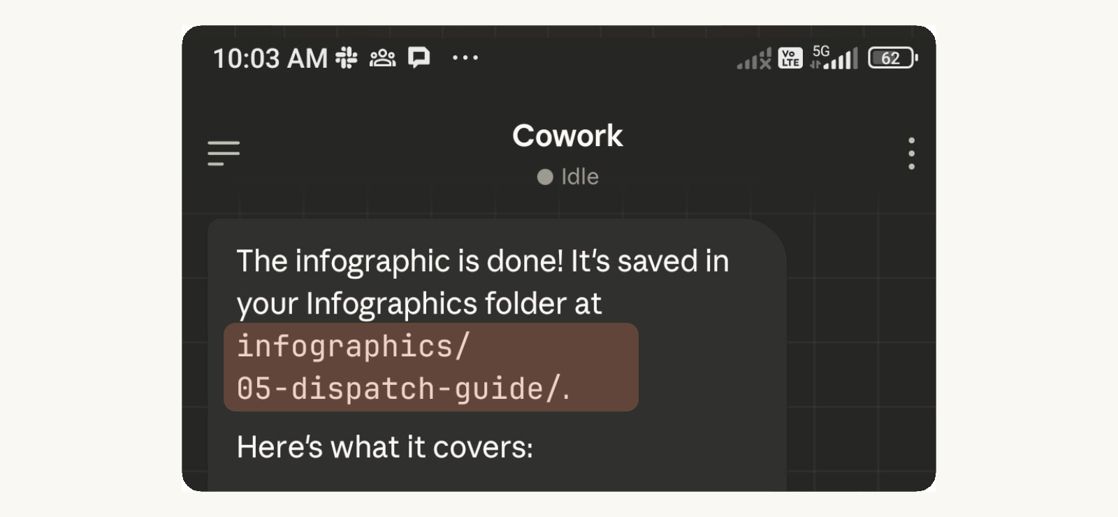 Step 2: Open the Claude mobile app. You’ll see the Dispatch tab. Start a conversation and tell it to run a Cowork task.