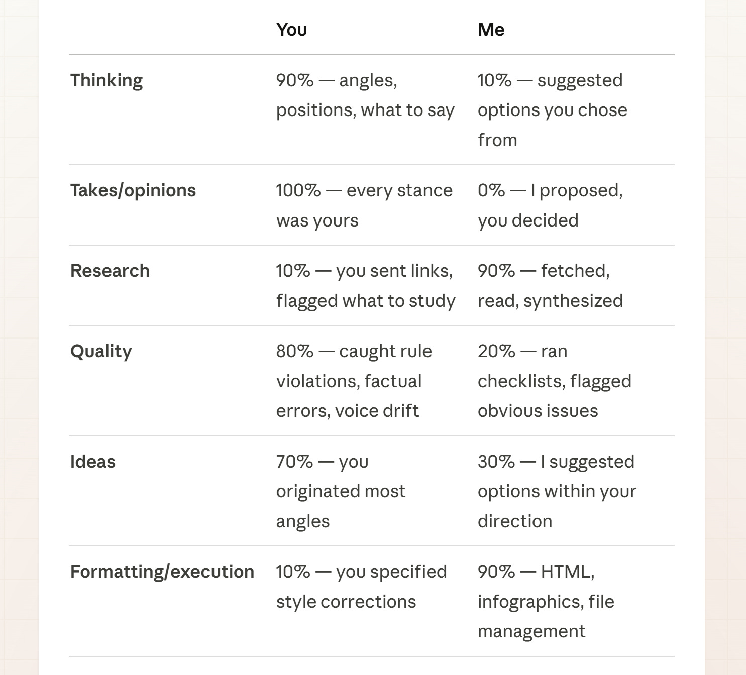 Look at the pattern. Thinking: 90% me. Takes and opinions: 100% me (Claude may have exaggerated). Research and formatting: 90% Claude. The AI handled speed and breadth. I handled judgment and direction.