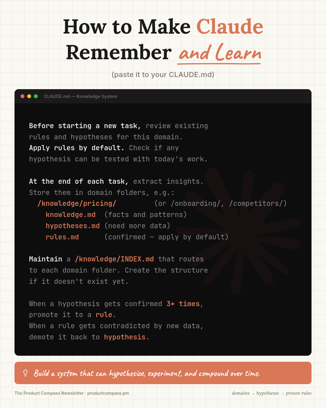 When a rule gets contradicted by new data, demote it back to hypothesis.How it works: Before every task, Claude reads the existing knowledge — active retrieval, not passive storage. The value isn't in the files. It's in Claude checking them mid-session before making a recommendation.