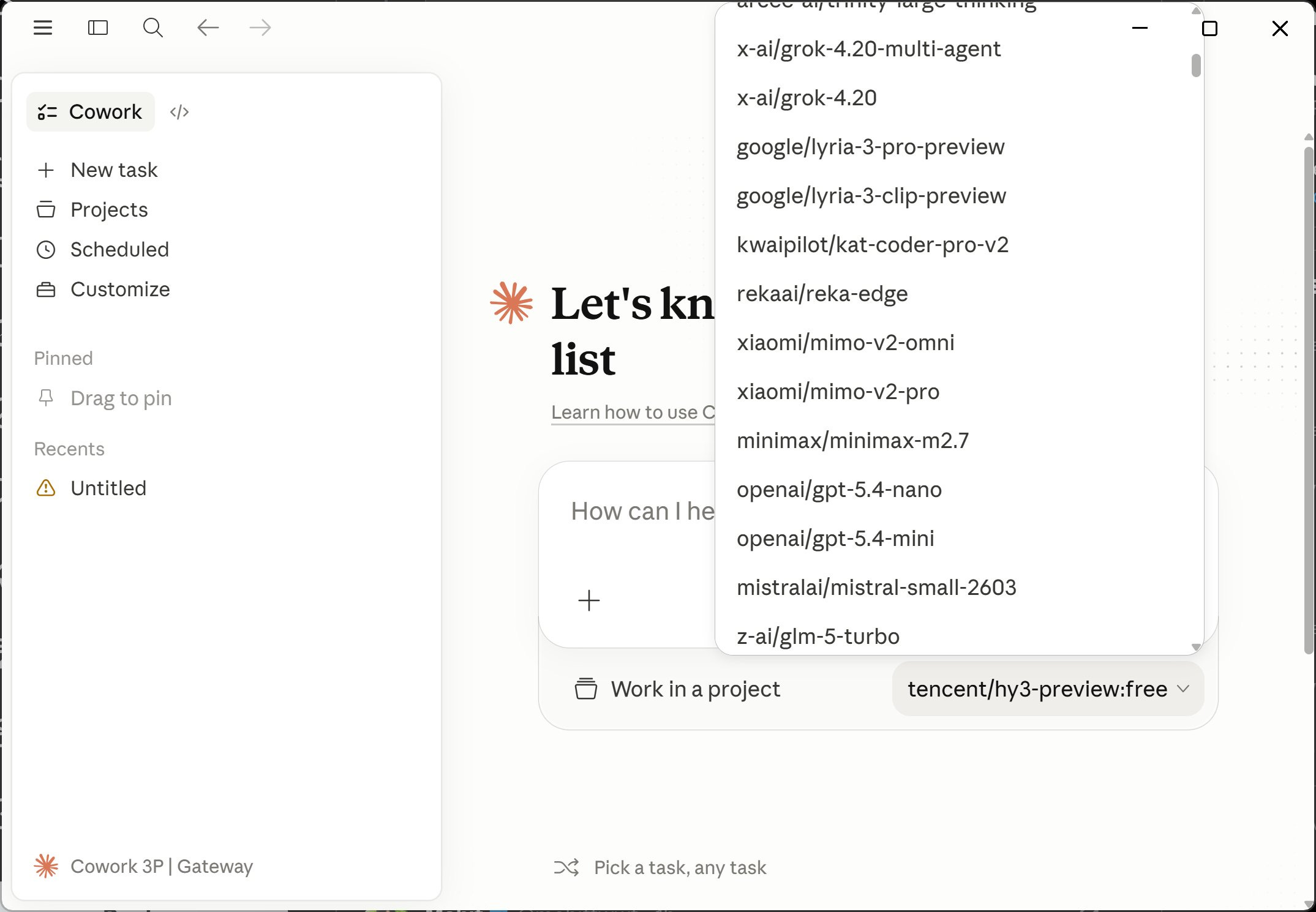Select an OpenRouter model. The free one that works for me: tencent/hy3-preview:free