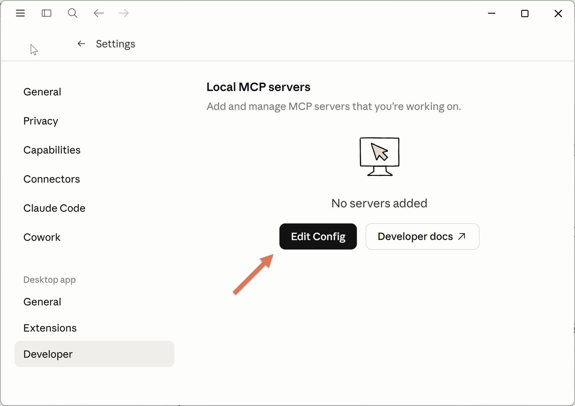 MCP servers are local. Add them under Settings → Developer.