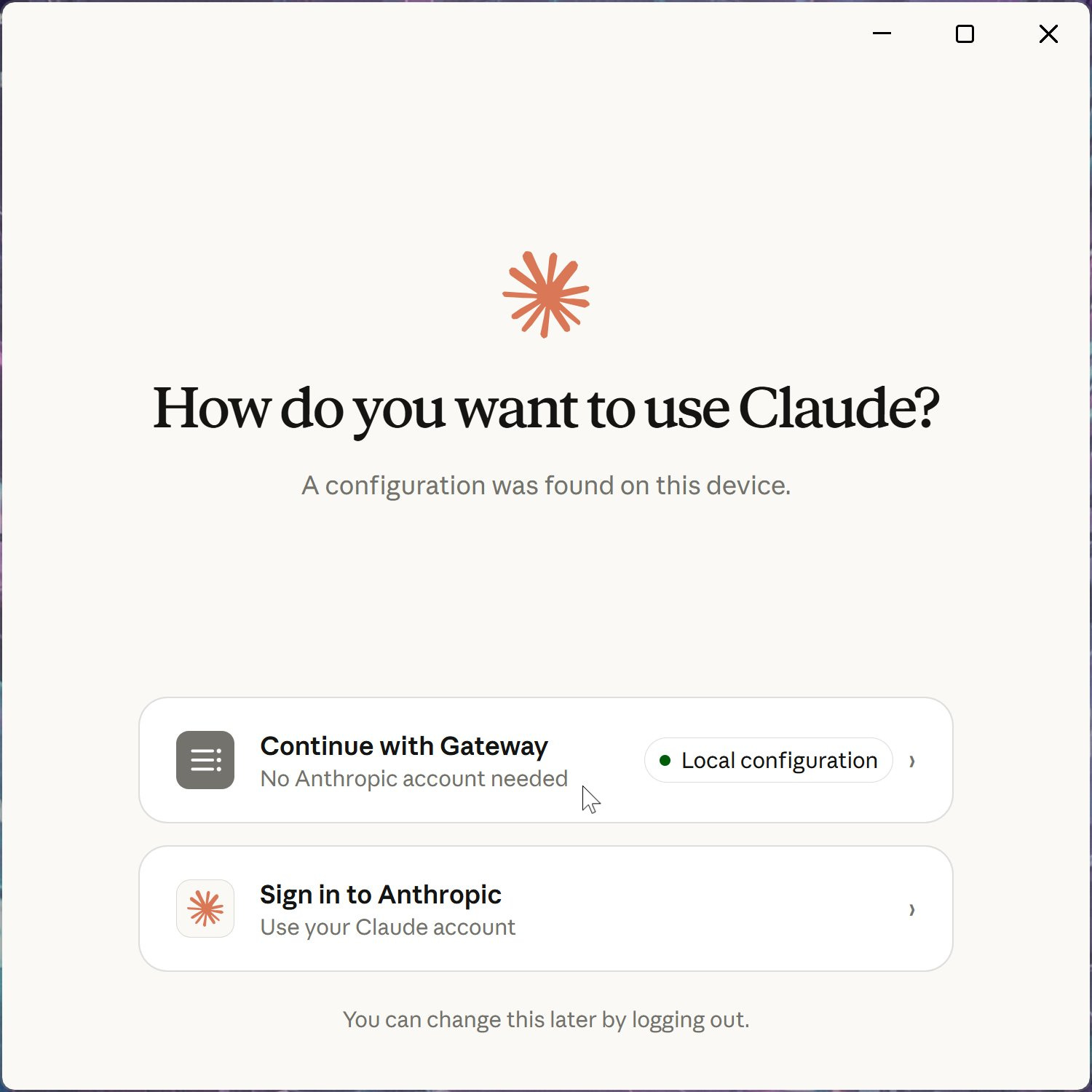 Log out, then Continue with Gateway: