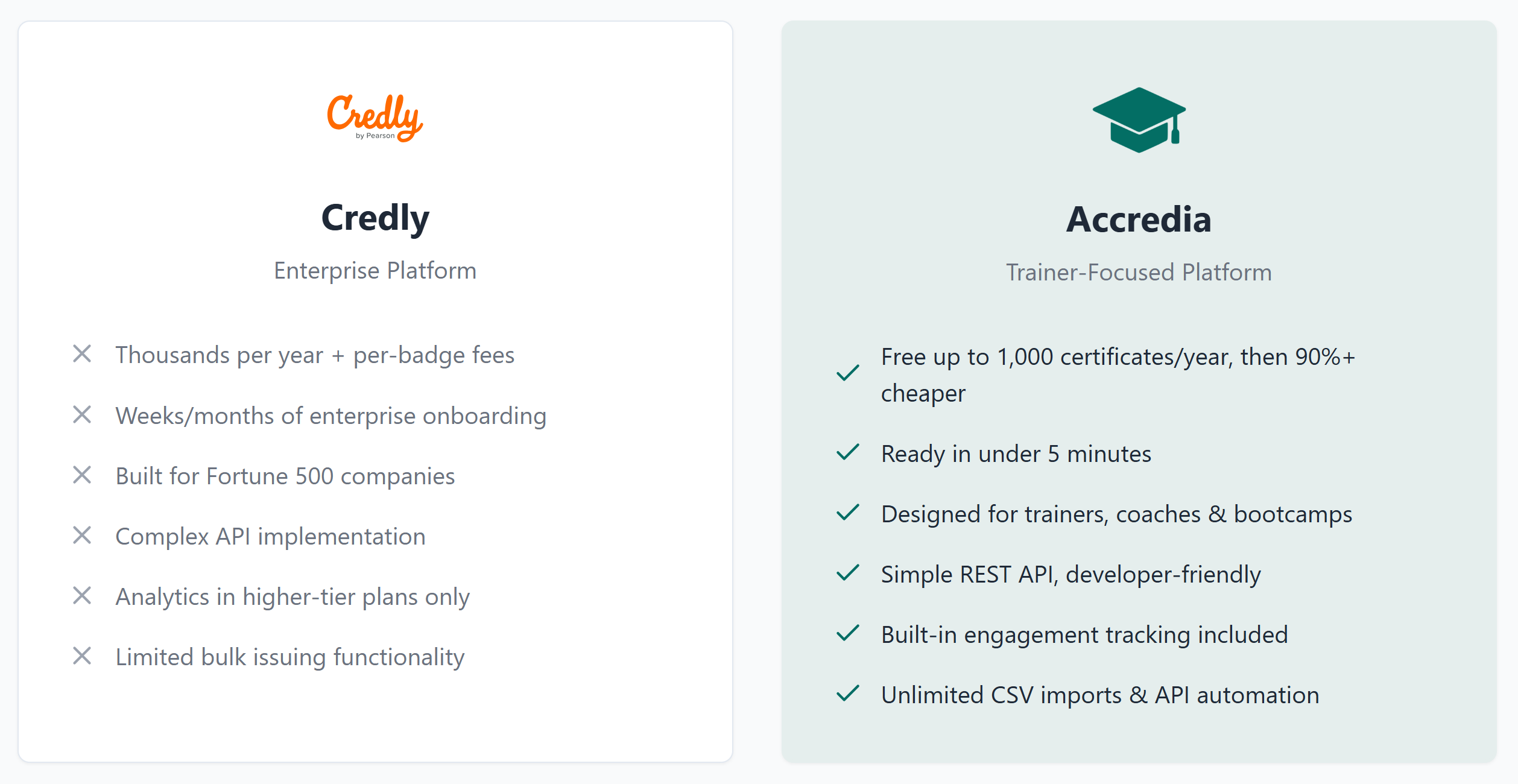 That's exactly what Accredia delivers: all the credibility and verification power of Credly, without the enterprise overhead, complex onboarding, or shocking price tags.