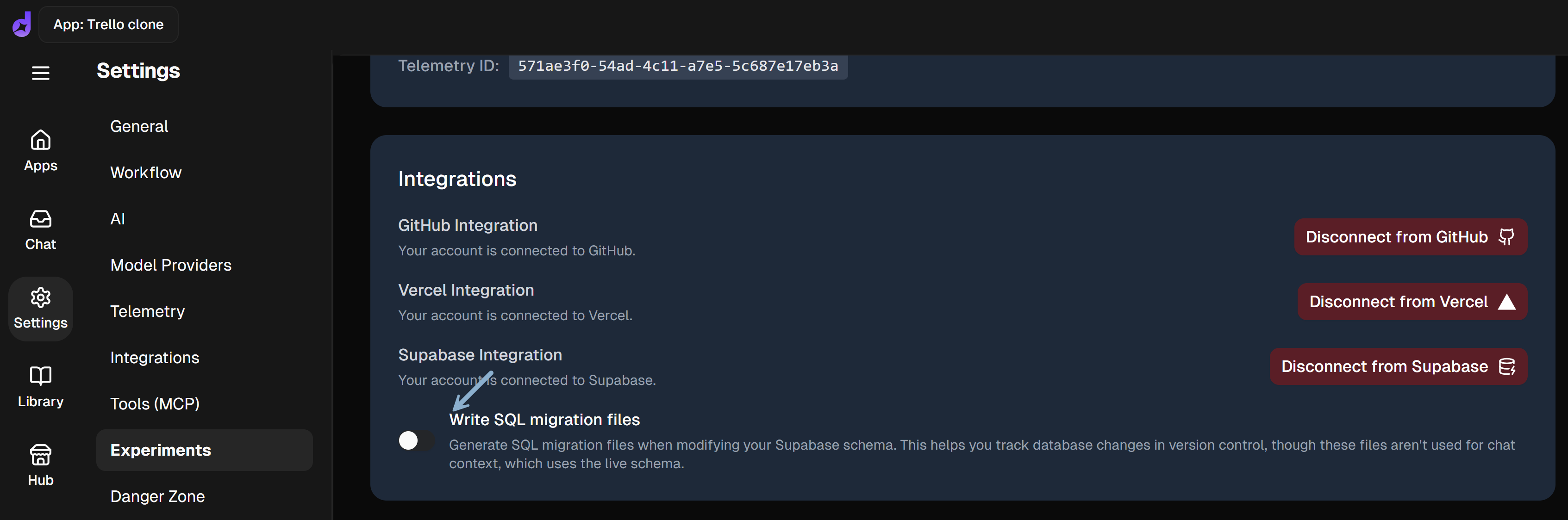 Enable branching similarly to what we discussed in How to Build and Scale Full-Stack Apps in Lovable Without Breaking Production and select an option to create SQL migration files: