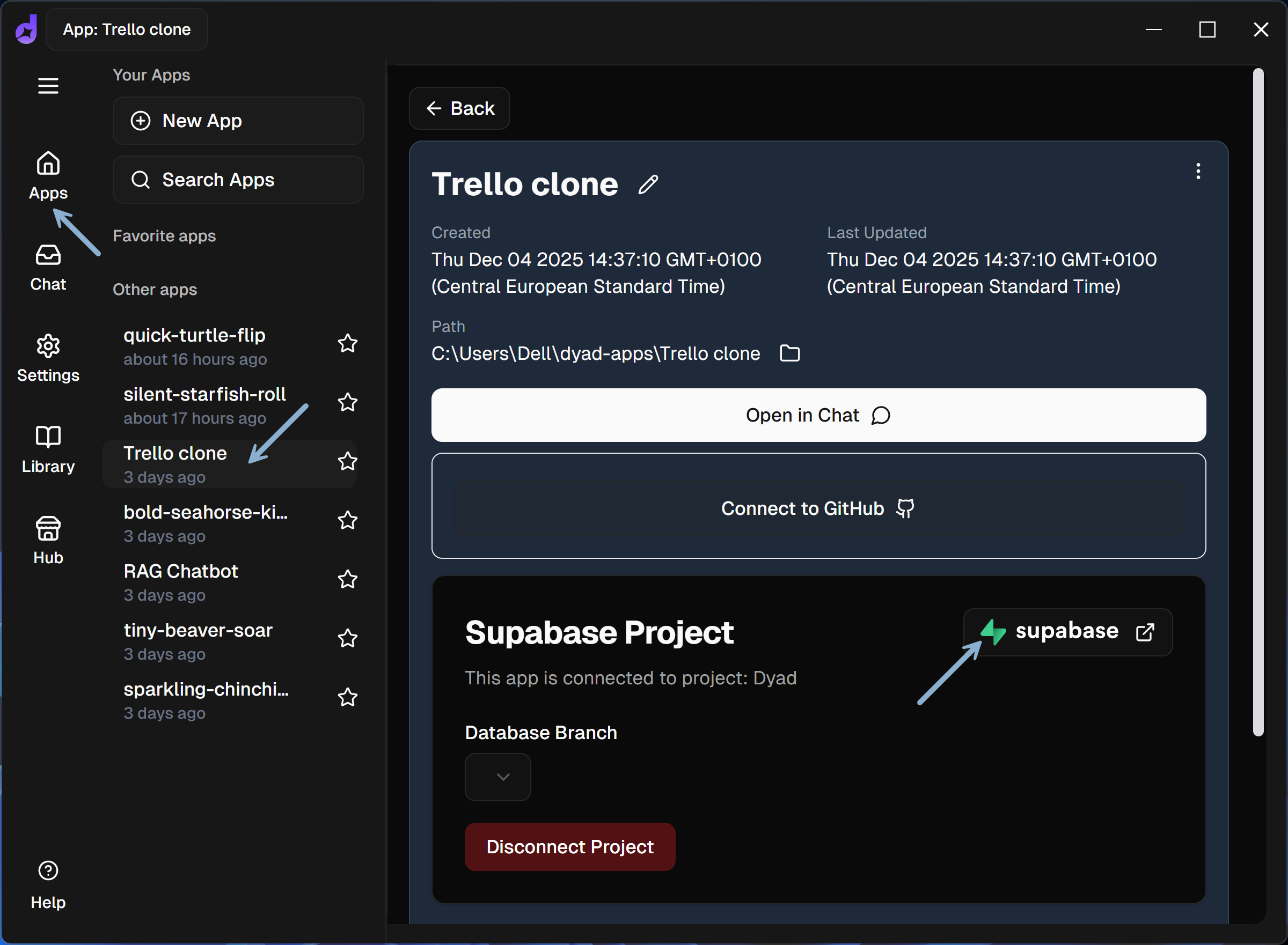 Step 6: Start a new Dyad “App.” Connect it to your Supabase.