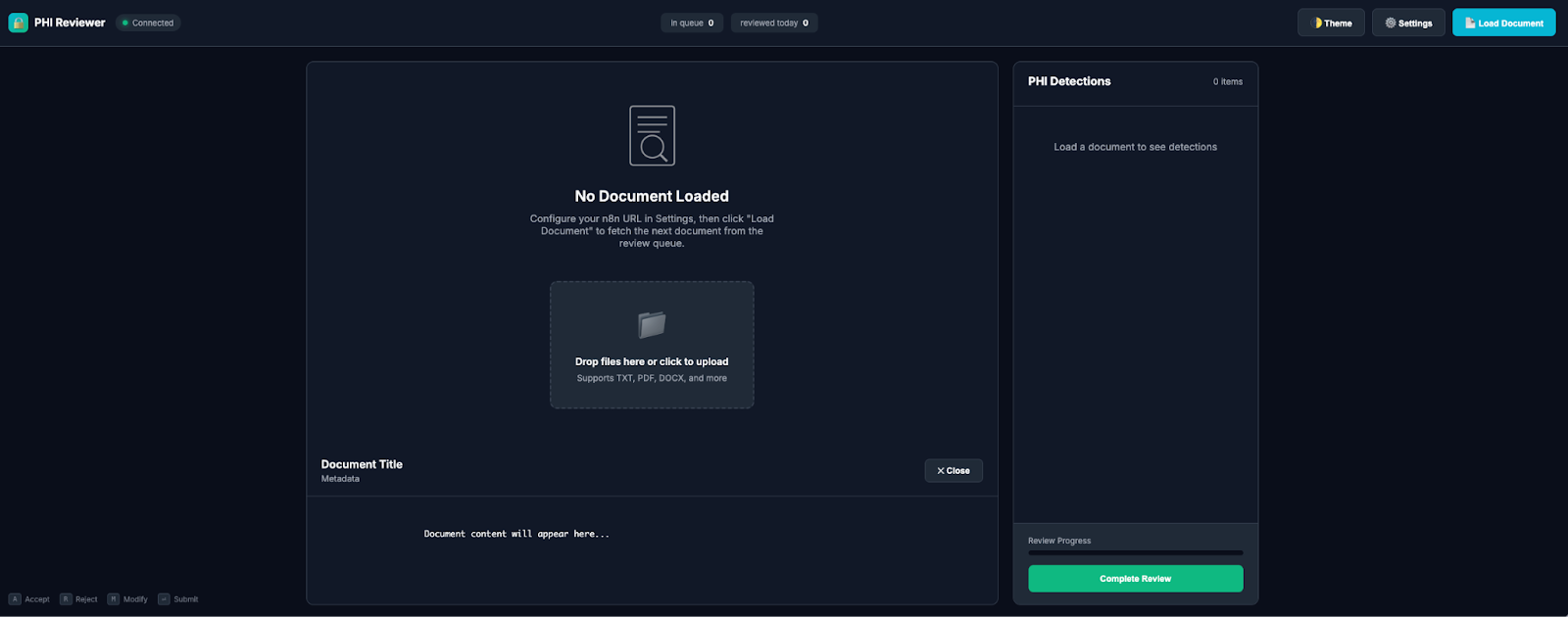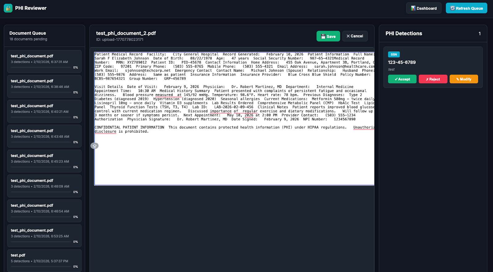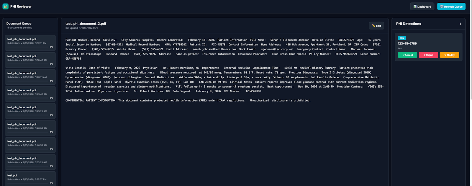 Documents that fall below the confidence threshold are routed to a web-based reviewer console. Trained virtual assistants (HIPAA-trained) can Accept, Reject, or Modify each AI detection. Every decision is logged to the immutable audit trail with reviewer ID and timestamp.