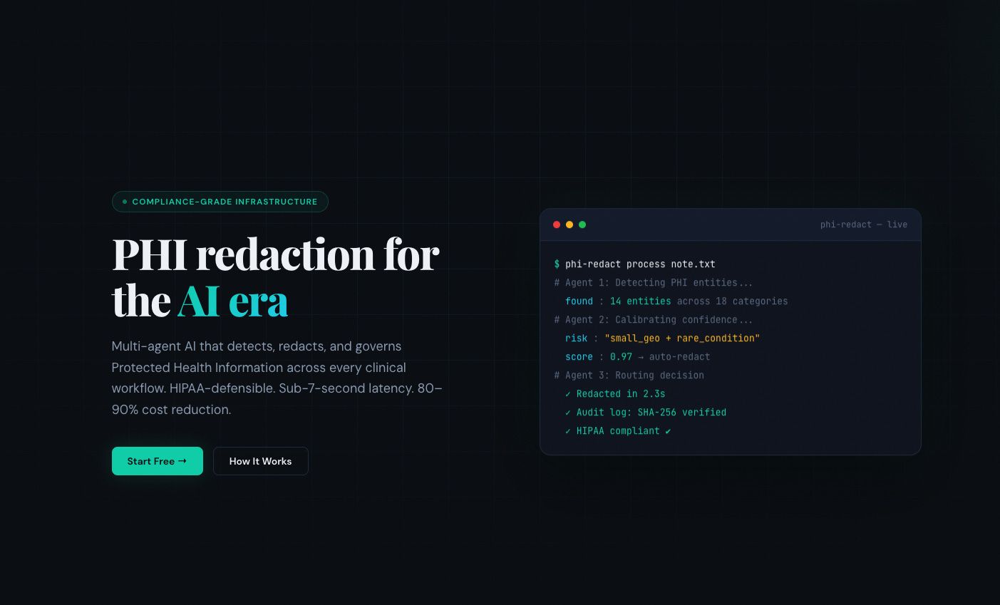PHI Redaction-as-a-Service is a compliance infrastructure platform built for healthcare AI teams, digital health startups, research organizations, and health-tech vendors. Built and maintained by Victor G. Phillips.