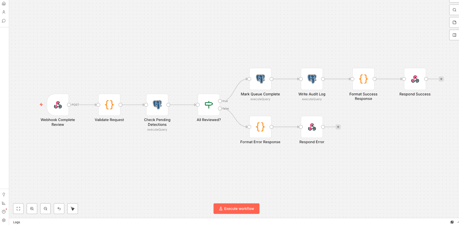 Five n8n workflows handle the complete document lifecycle: Detection, Fetch, Submit Decision, Complete Review, and Update Document. Each is a webhook-triggered pipeline with PostgreSQL persistence and full error handling.