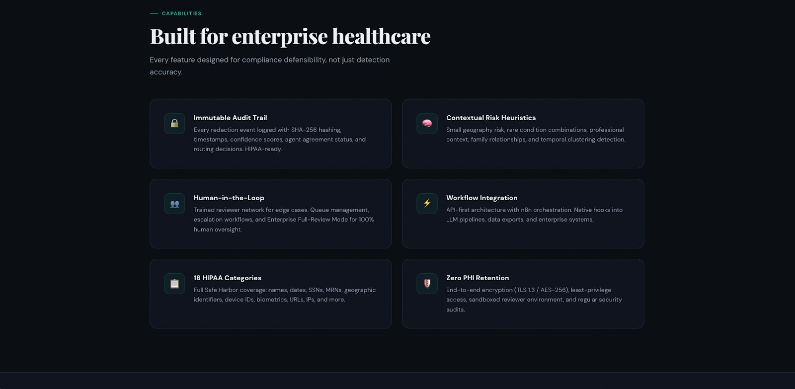 AI detection alone is generally not HIPAA-defensible for high-stakes workflows. A defensible system requires an immutable audit trail documenting what was detected, confidence scores, agent agreement, reviewer decisions, and SHA-256 integrity hashes. PHI-RaaS generates this automatically and routes low-confidence documents to trained human reviewers, making the combined system audit-ready.