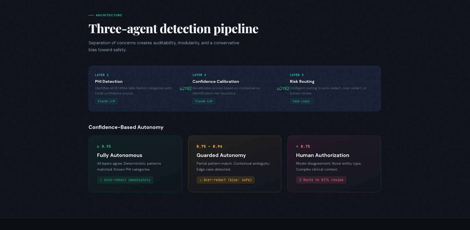 Splitting detection, calibration, and routing into independent agents means each decision is independently logged, traceable, and replaceable. In a compliance audit, multi-layer verification is demonstrably stronger than single-pass detection.
