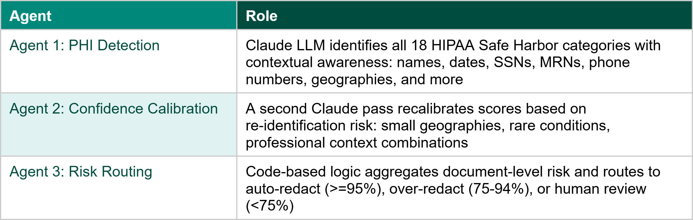 Key insight: Pattern matching sees “Dr. Martinez” and “Elko, Nevada” as separate low-risk items. Claude understands that together, a named physician in a small rural geography, they create uniquely identifying re-identification risk.