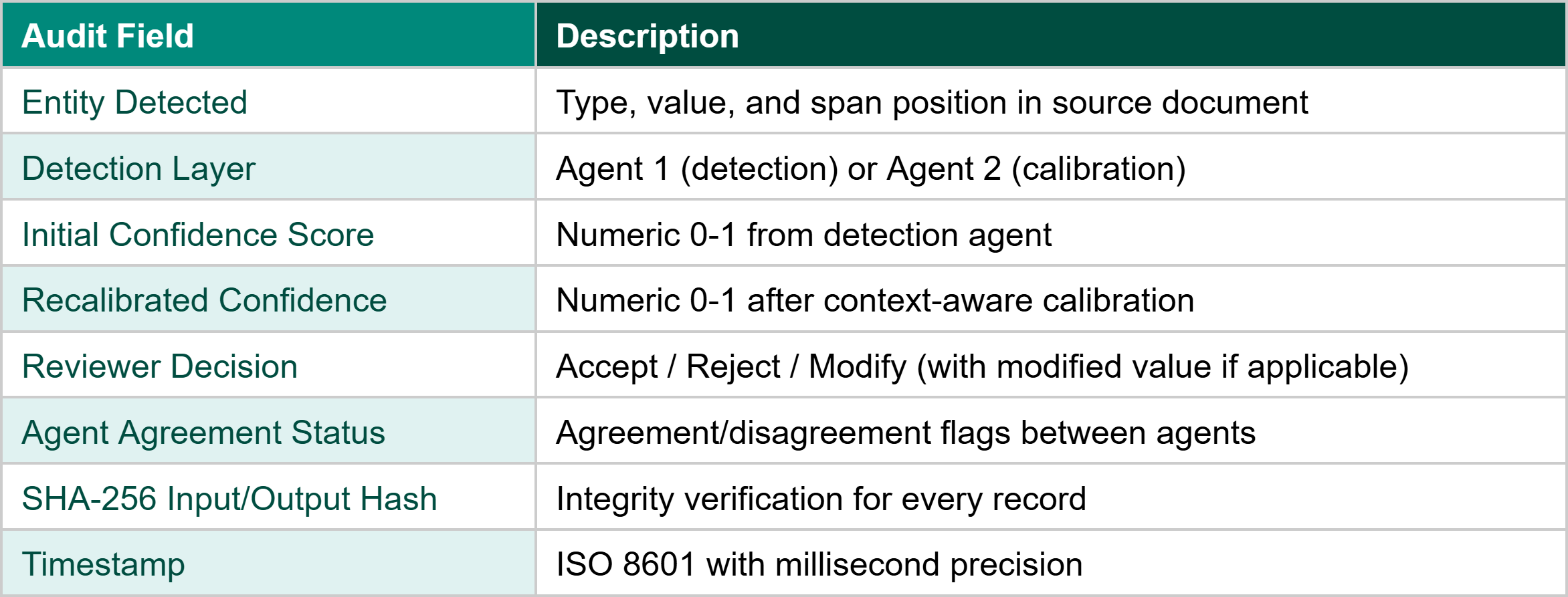 Every redaction event generates an immutable PostgreSQL audit log entry with the detected entity type, value, position, confidence scores, agent agreement status, routing decision, reviewer ID, reviewer decision, SHA-256 input/output hash, and ISO 8601 timestamp. This provides a complete, queryable evidence trail that directly addresses OCR audit questions about how PHI removal was ensured.