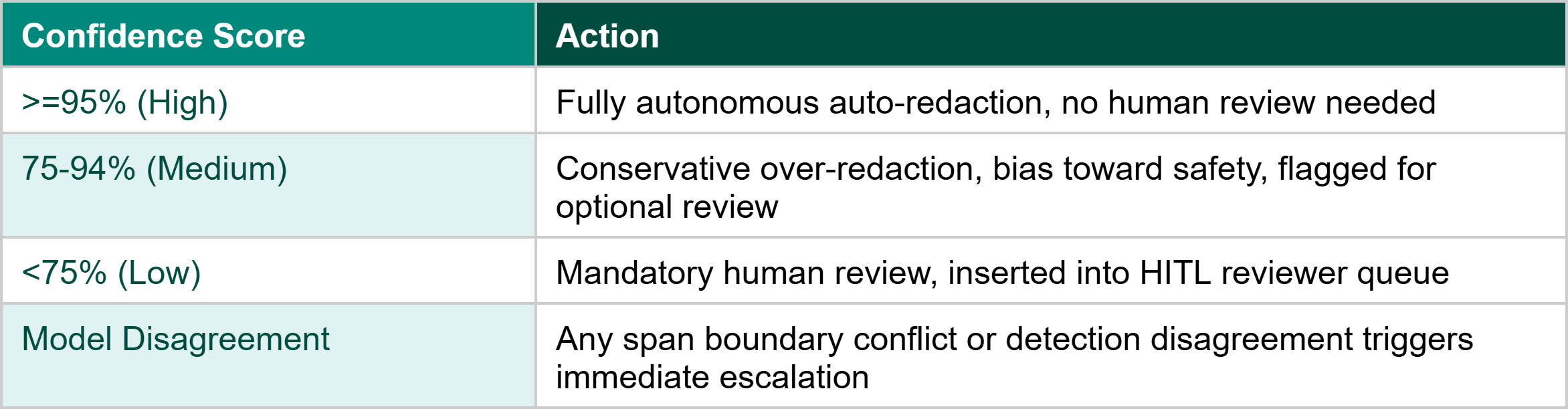 Fewer than 5% of documents are routed to human review. Documents with average confidence >=95% are auto-redacted. Documents in the 75-94% range are over-redacted conservatively without human review. Only documents below 75% confidence, or those with model disagreement on entity spans, are sent to the human reviewer queue.