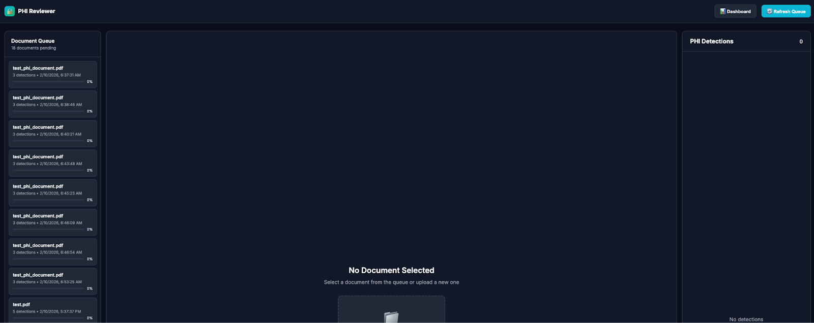 Detection alone is not HIPAA-defensible. What auditors actually ask for is the evidence trail: what was detected, by whom or what, when, with what confidence, and what action was taken. PHI-RaaS generates immutable PostgreSQL audit logs for every redaction event.