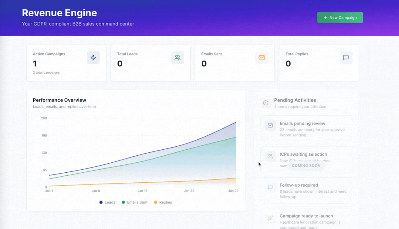 Track Active Campaigns, Total Leads, Emails Sent, and Reply Rates in one view. Performance trajectory graph + Pending Activities queue keeps your team focused on what needs action: