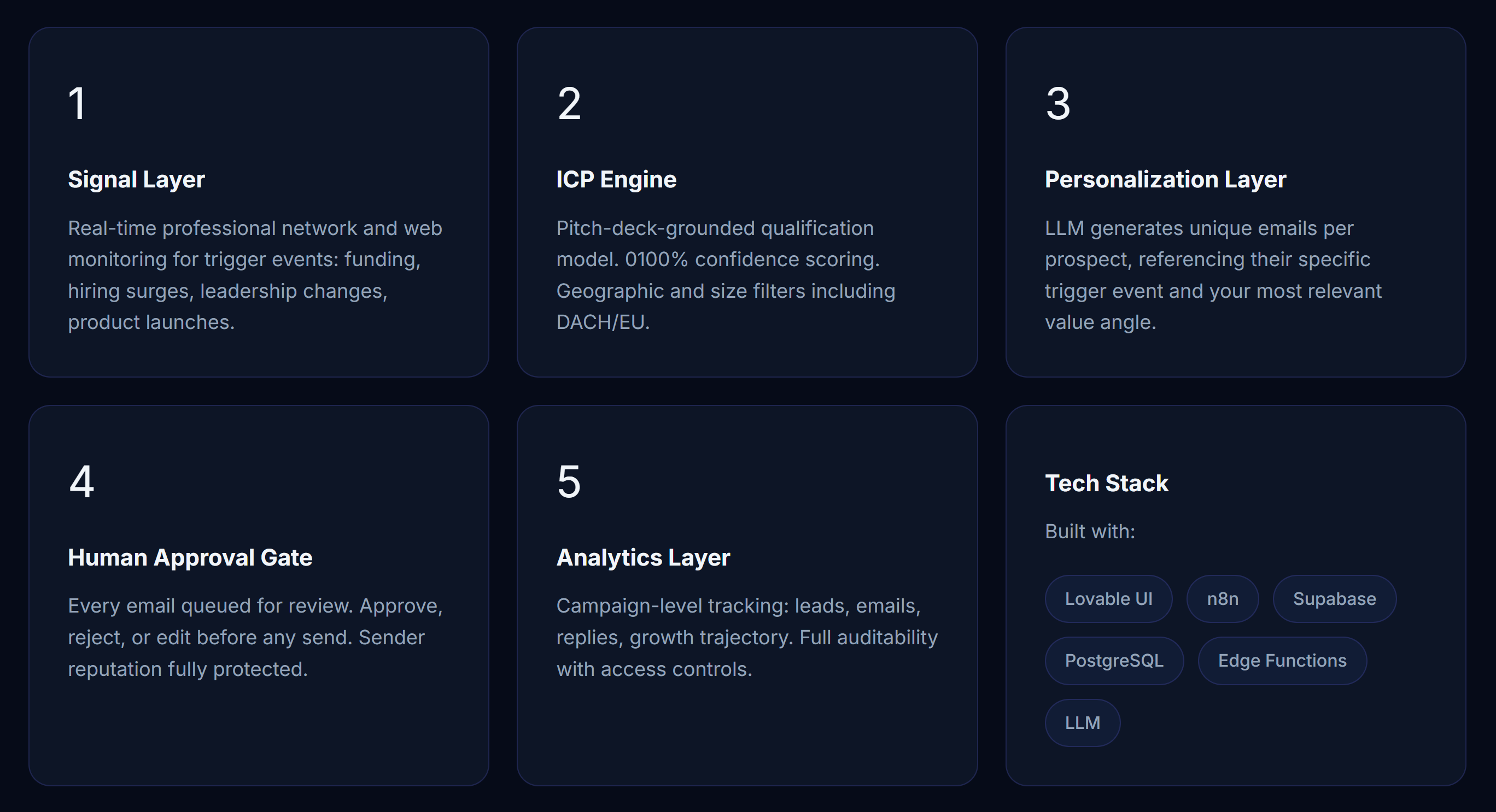 Five-layer pipeline: Signal ICP Personalization Human Gate Analytics.