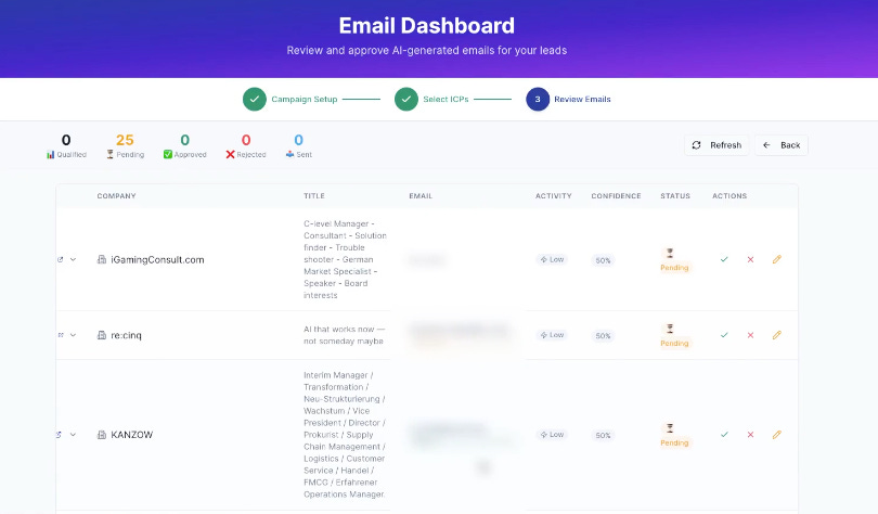 Every AI-drafted email surfaces for human approval. Review company, title, activity level, and confidence score. Approve , reject , or edit nothing sends without your sign-off: