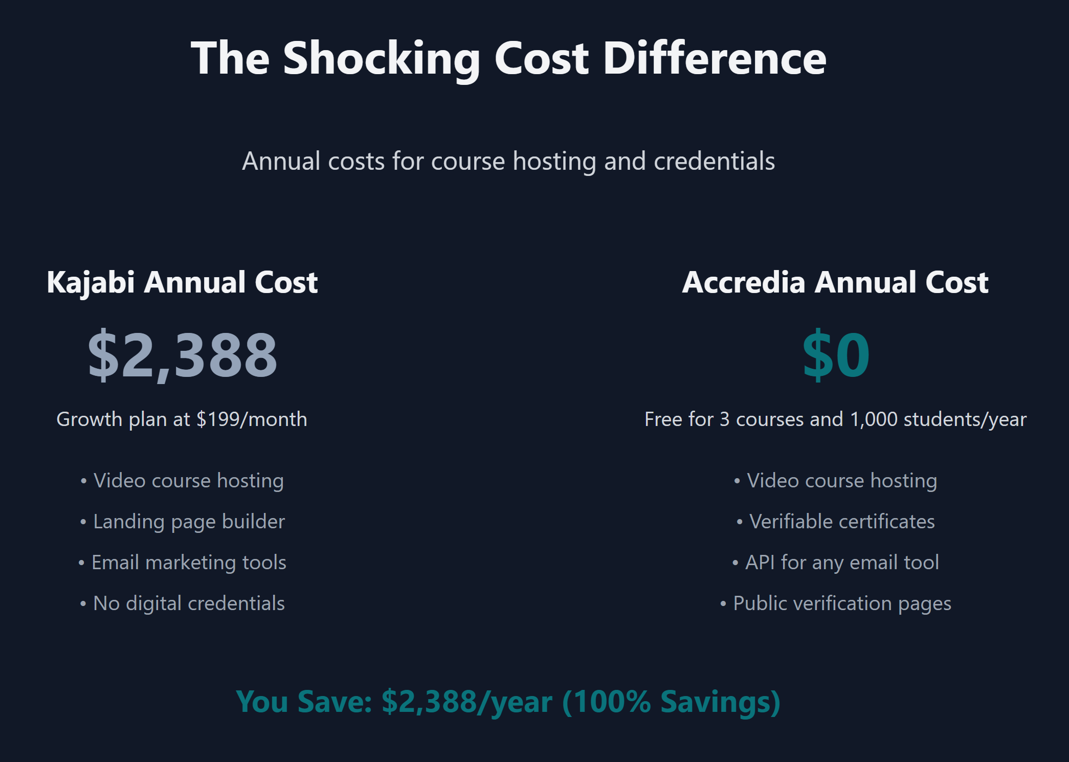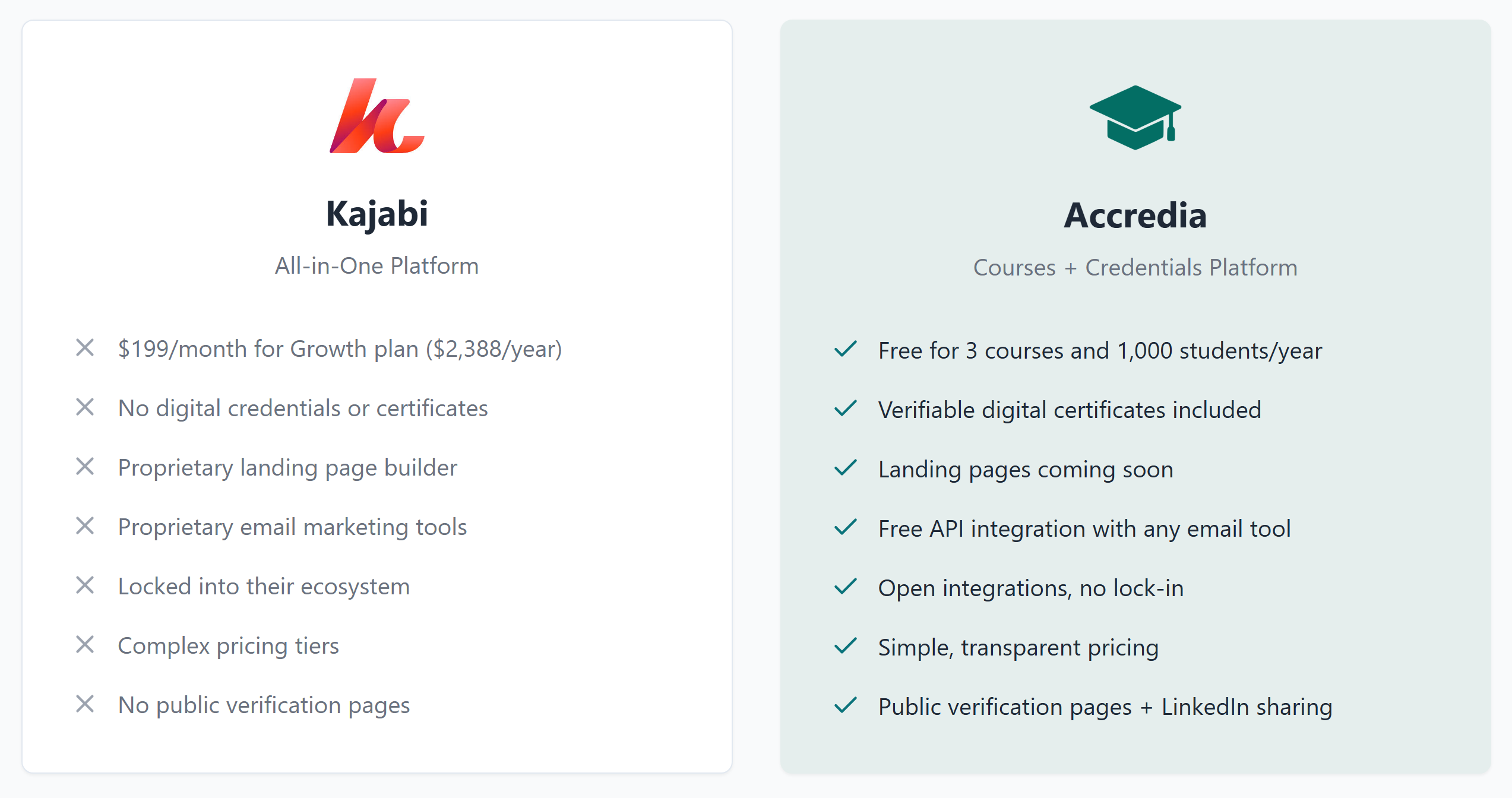 Kajabi charges $199/month but doesn't offer verifiable certificates. Accredia gives you video courses with digital credentials for free—so your learners can prove what they've achieved.