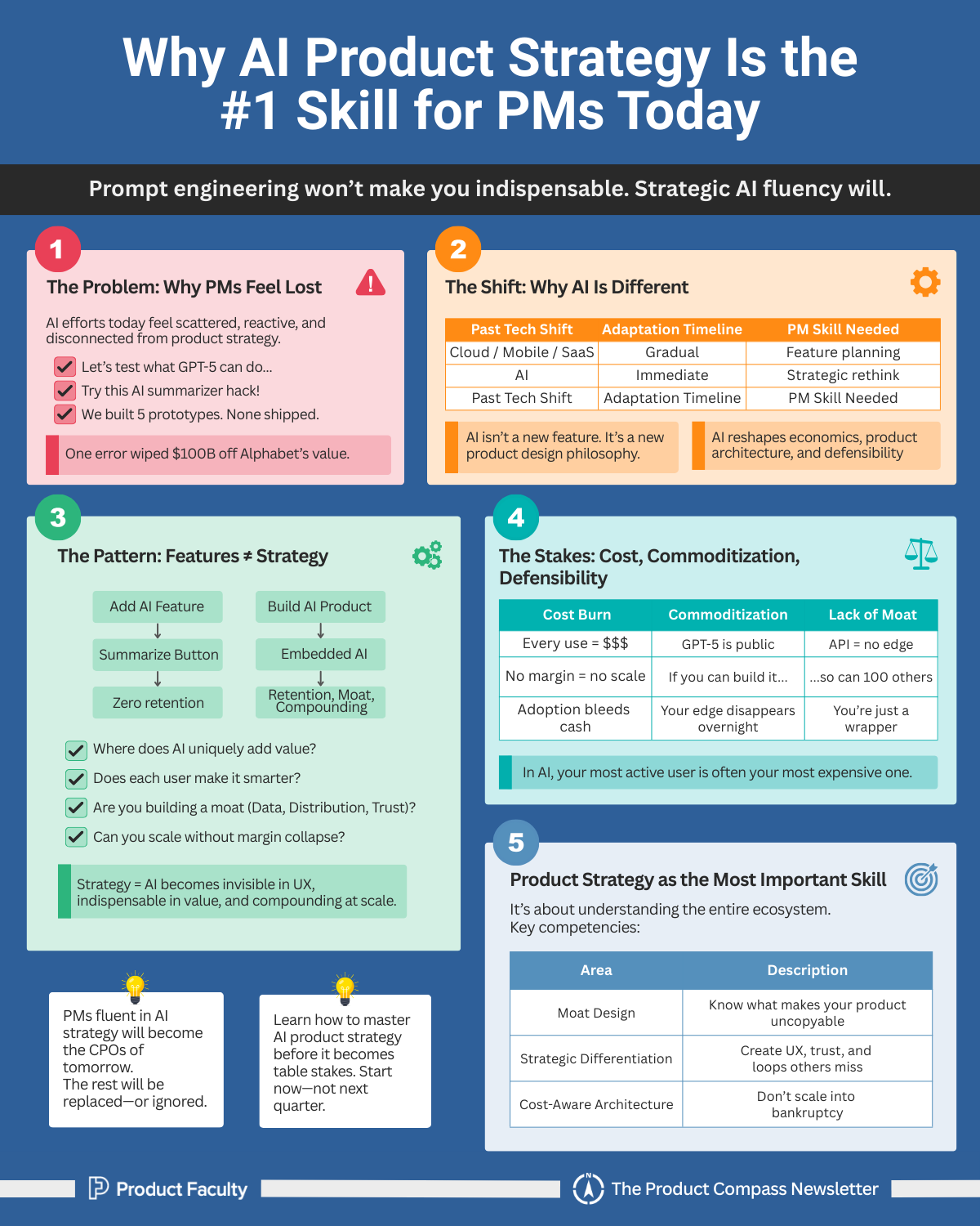 This is why AI product strategy is the most important skill for PMs right now. Again, it’s not just about writing clever prompts. It’s about understanding the full ecosystem: from moat to differentiation, from design to deployment, from experimentation to organizational leadership.