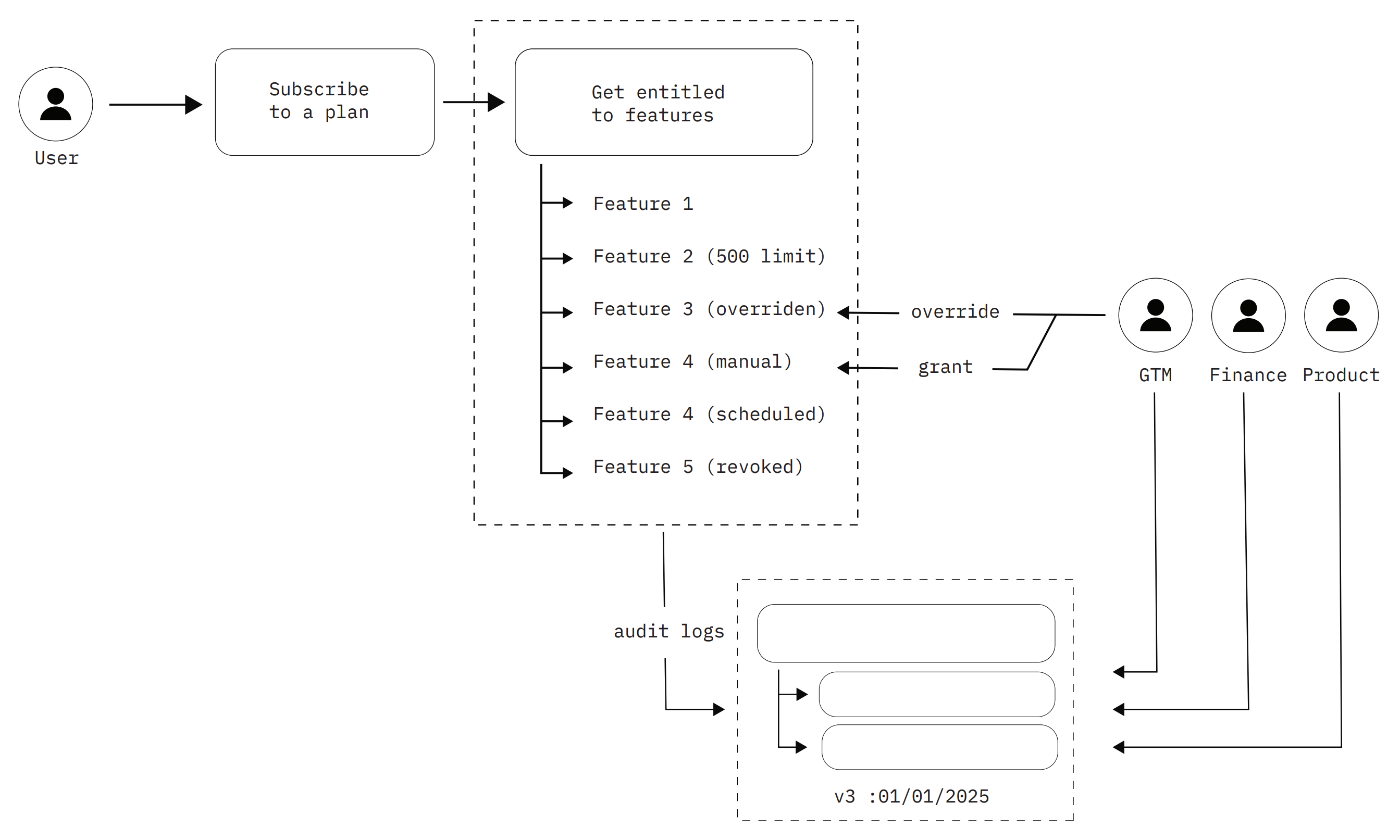 The entitlements system supports overrides, grants, scheduled access, and revocation — all managed by Product, Finance, and GTM teams through the control plane, with full audit logs: