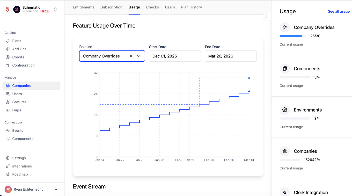 Tools like Schematic, Metronome, and Orb handle event ingestion, period-aware aggregation, and real-time usage APIs out of the box. Building this in-house is a common source of “metering debt” that quietly eats engineering quarters.
