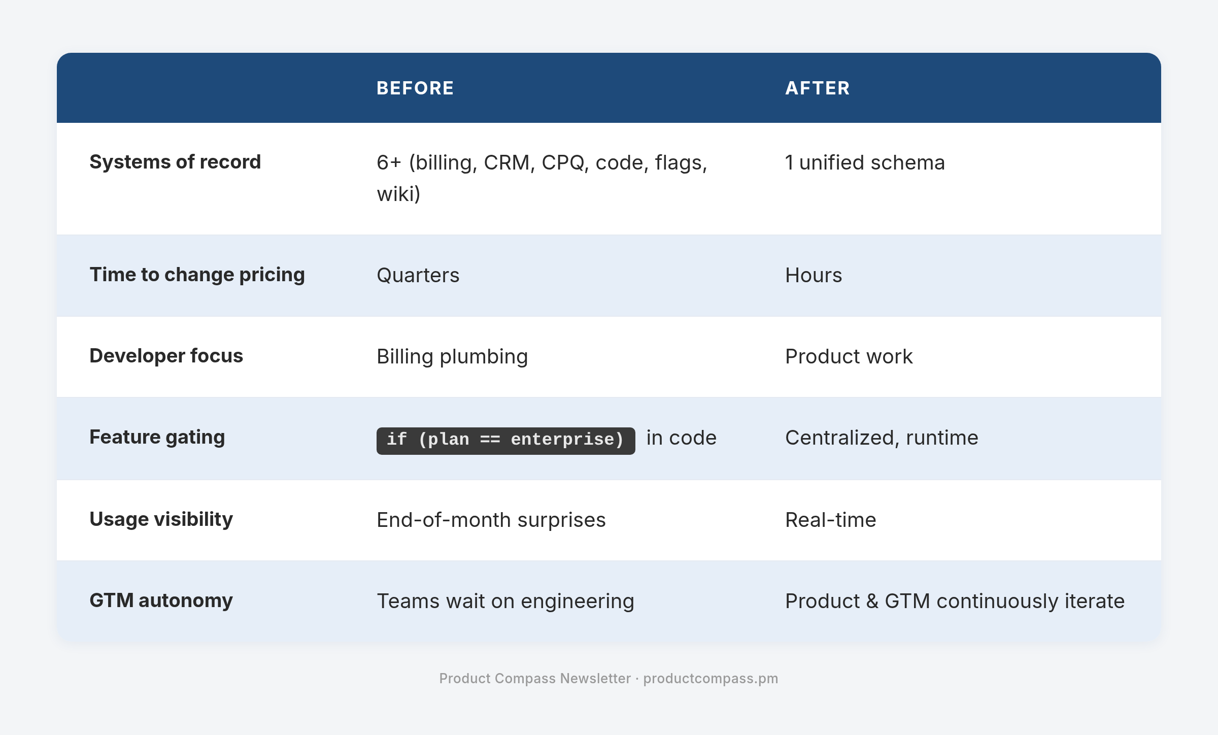The architectural failure. Even when you have the right strategy and the will to act, your codebase won’t let you. R&D teams pour millions into “Monetization Plumbing” that delivers zero core product value. Jalal Iftikhar, who leads Business Technology at Notion, puts it sharply: “Usage-based billing systems are designed to consume events from products to then inform invoices. They’re not designed to enable the commercial tinkering on pricing & packaging that drives growth.”