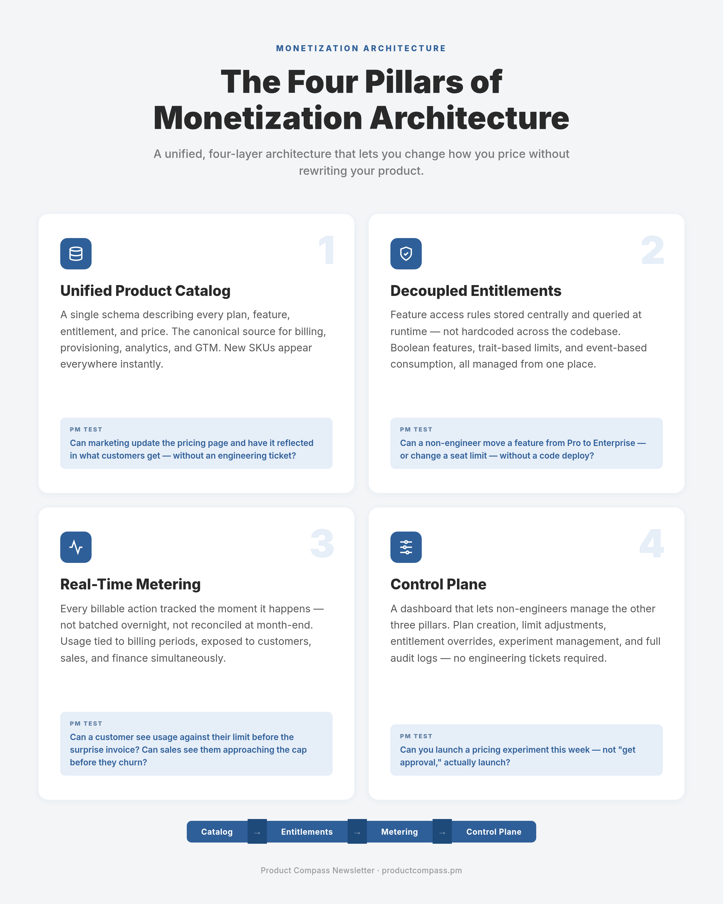The four pillars of monetization architecture — unified catalog, decoupled entitlements, real-time metering, and a control plane — with PM tests for whether yours is broken