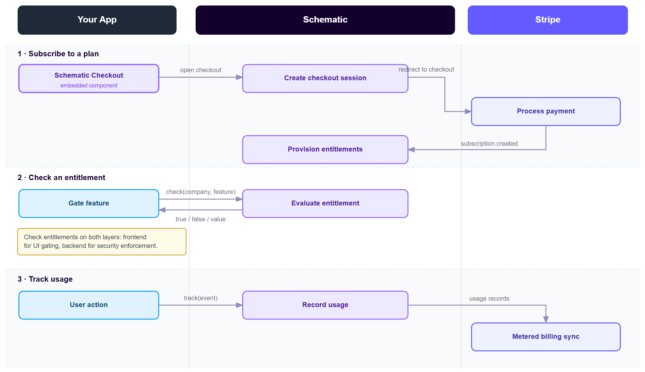 The diagram below shows how these pillars connect in practice — plan subscription, entitlement checking, and usage tracking all flowing through a central platform: