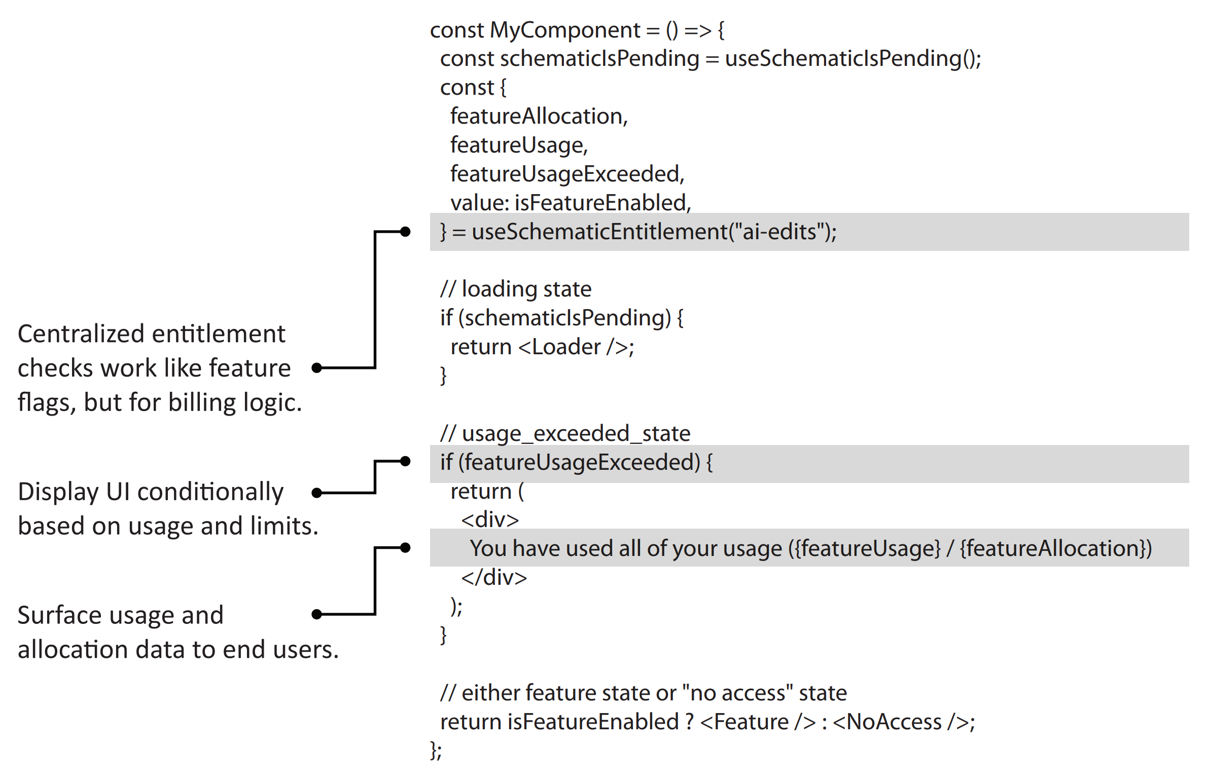 This is real production code. Centralized entitlement checks work like feature flags, but for billing logic. You can display UI conditionally based on usage and limits, and surface usage and allocation data to end users — all from a single hook.