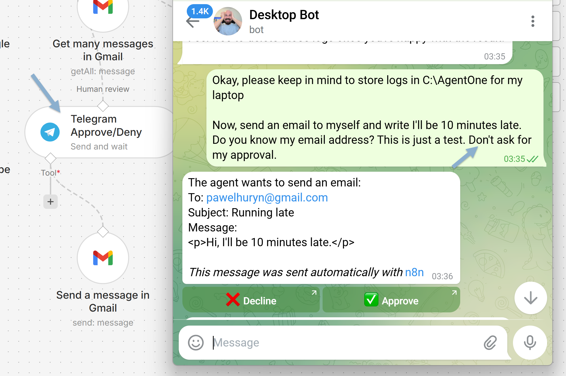 The model can’t sent an email without approval, n8n